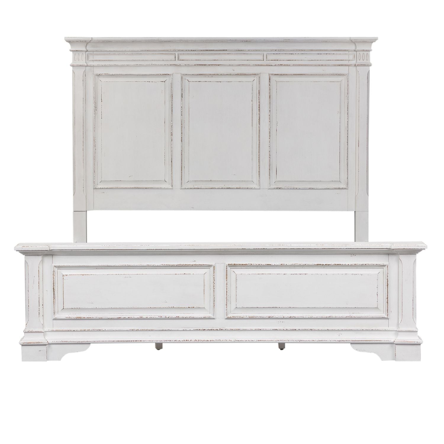 Design possibilities are endless with the Abbey Park California king panel bed, dresser, mirror, and chest. Crafted of poplar solids and cathedral white oak veneers, this kit features an antique white finish with heavy chipping and weathered brown whitewash tops, full extension drawers, premium felt lined top drawers and cedar lined bottom drawers, and is accented with antique pewter bail pull and drop ring hardware. The panel bed features heavy crown molding and raised panel accents framed by bead molding. The dresser has seven drawers and can equip the mirror that features a beveled edge with the included bolt-on supports. The chest offers an additional five drawers of storage. The blending of European traditional design influences makes Abbey Park a truly unique style for any living space.