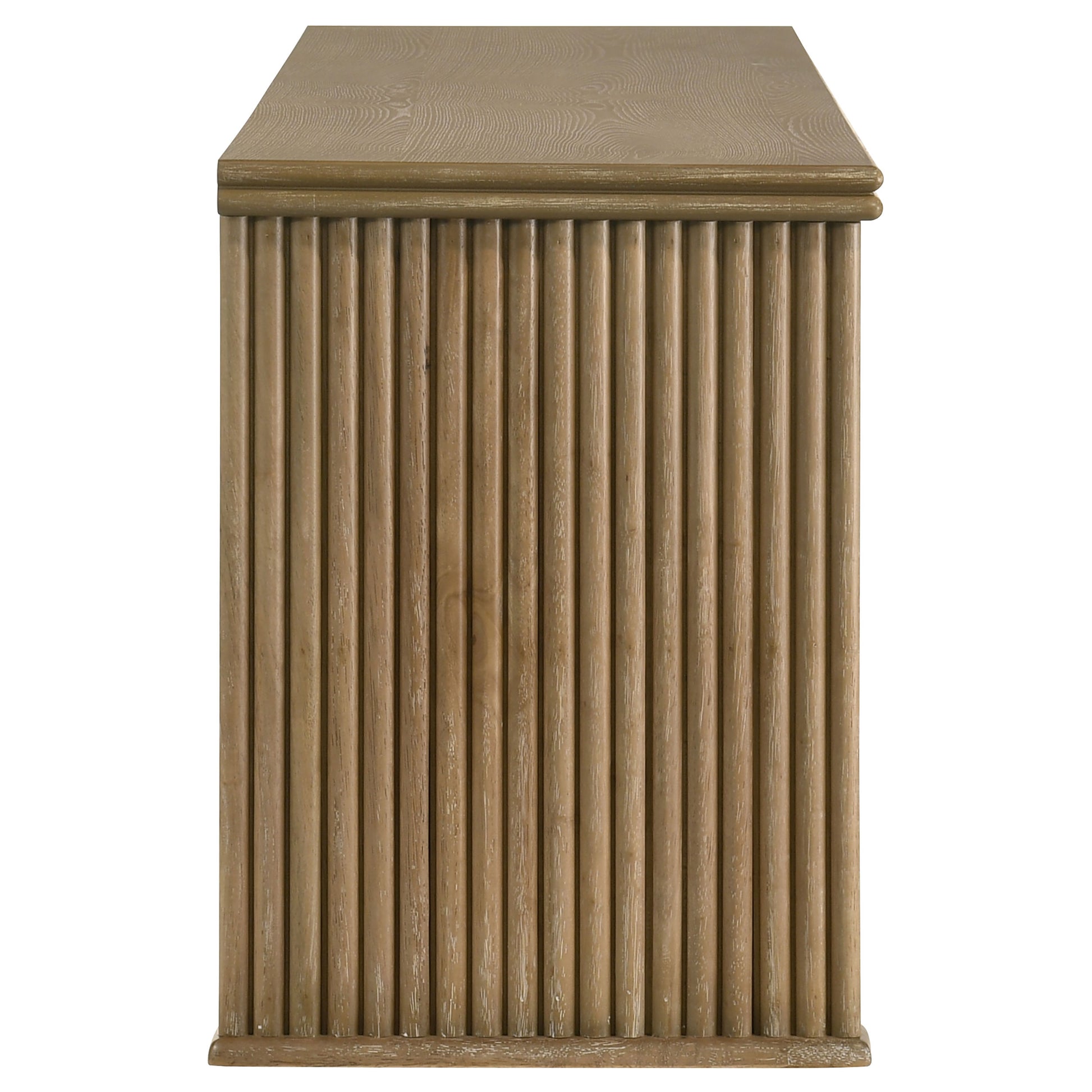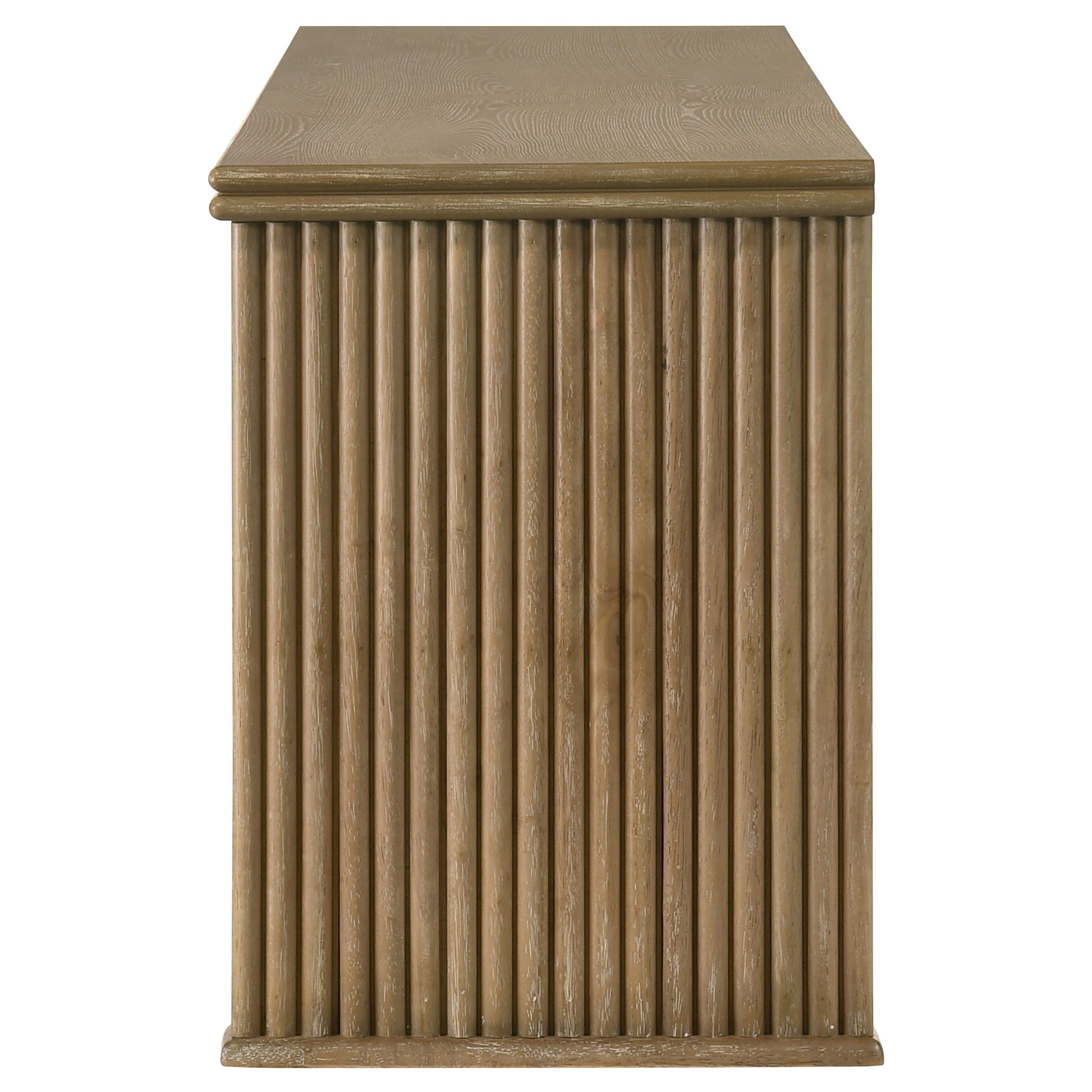 This seventy-inch TV stand combines sculptural texture and functional storage for a grounded living room anchor. Four flat-panel doors conceal generous interior space, complete with adjust shelving and rear cable access cutouts for organized media setup. Vertical reeding along the sides adds visual rhythm to the clean-lined form, while a distressed light brown finish highlights the natural grain. Built from engineered wood and ash veneer, this media console offers both form and utility.