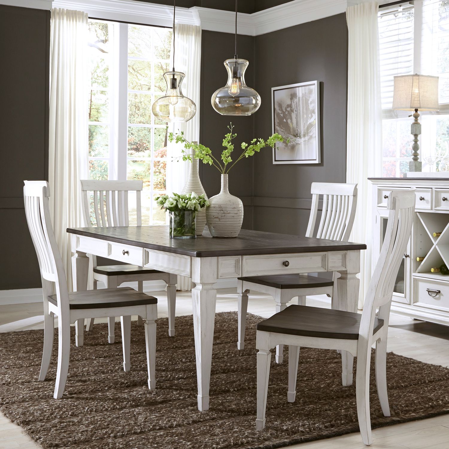 Sitting pretty with the Allyson Park five-piece rectangular table set. Crafted of pine solids and veneers with a cathedral white oak top, this set features wire brushed white finish and a wire brushed charcoal top. This set consists of the rectangular leg table and four slat back side chairs. The table has a fixed planked top, a total of four full extension felt lined drawers; one for each side of the table, accented with pewter knob hardware, bead molding, and squared tapered legs. This table is perfect for creating a classic look while maintaining a casual feel. The slat back side chairs have saddle shaped contouring on the seat for added comfort with tapered legs and nylon chair glides to protect your flooring. Allyson Park offers cottage styles you love in a wire brushed two tone finish that will work from the beach to the mountains to an industrial loft.