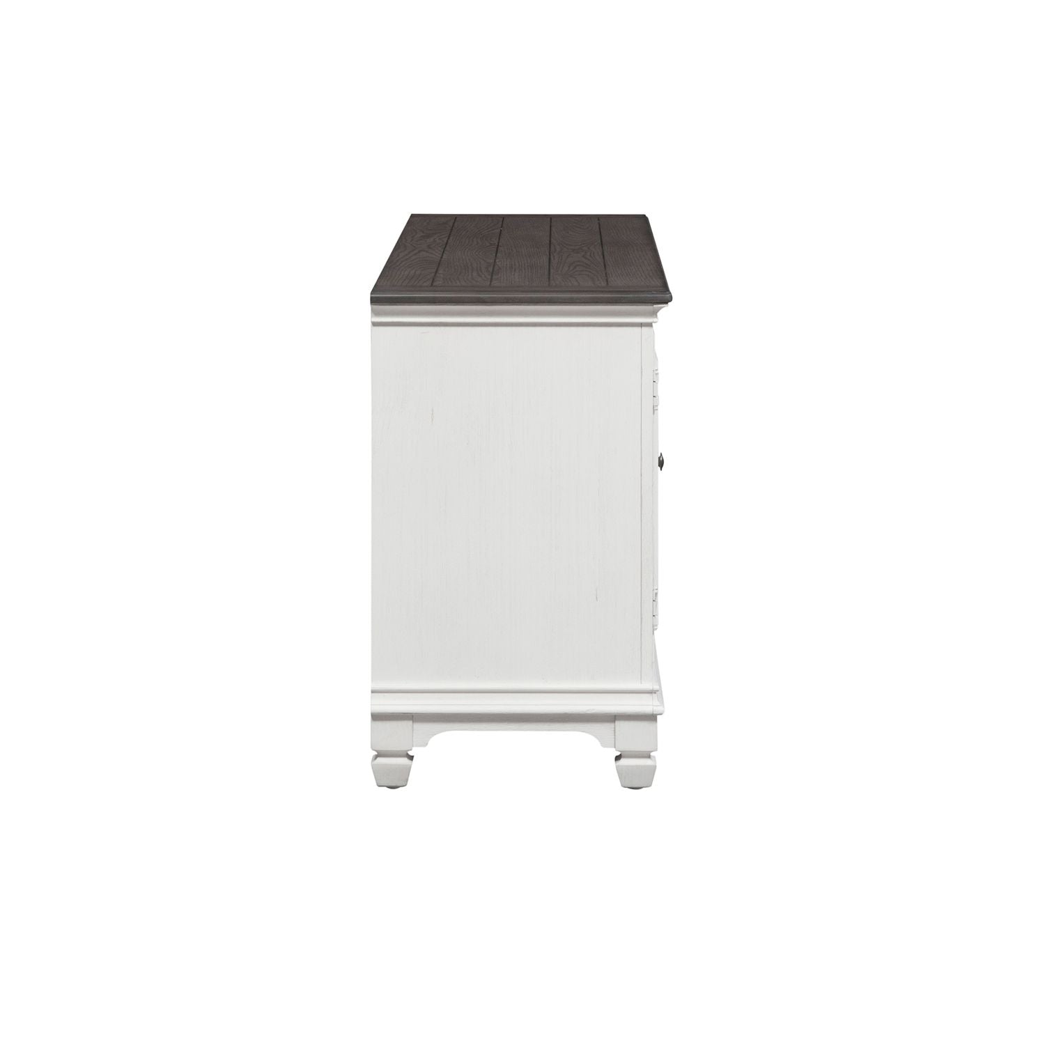 Indulge in a classic look and casual feel with the Allyson Park 66" tv console. Crafted with pine solids and veneers with cathedral white oak veneer top, this piece accommodates most 72" TVs and features a wire brushed white finish with charcoal planked tops, antiqued pewter knob hardware, full extension drawer glides for easy access to storage, fully stained interior drawers, square tapered feet and 1 adjustable shelf behind each door. The open compartment and wire management provisions effortlessly accommodate electronics or gaming equipment.
