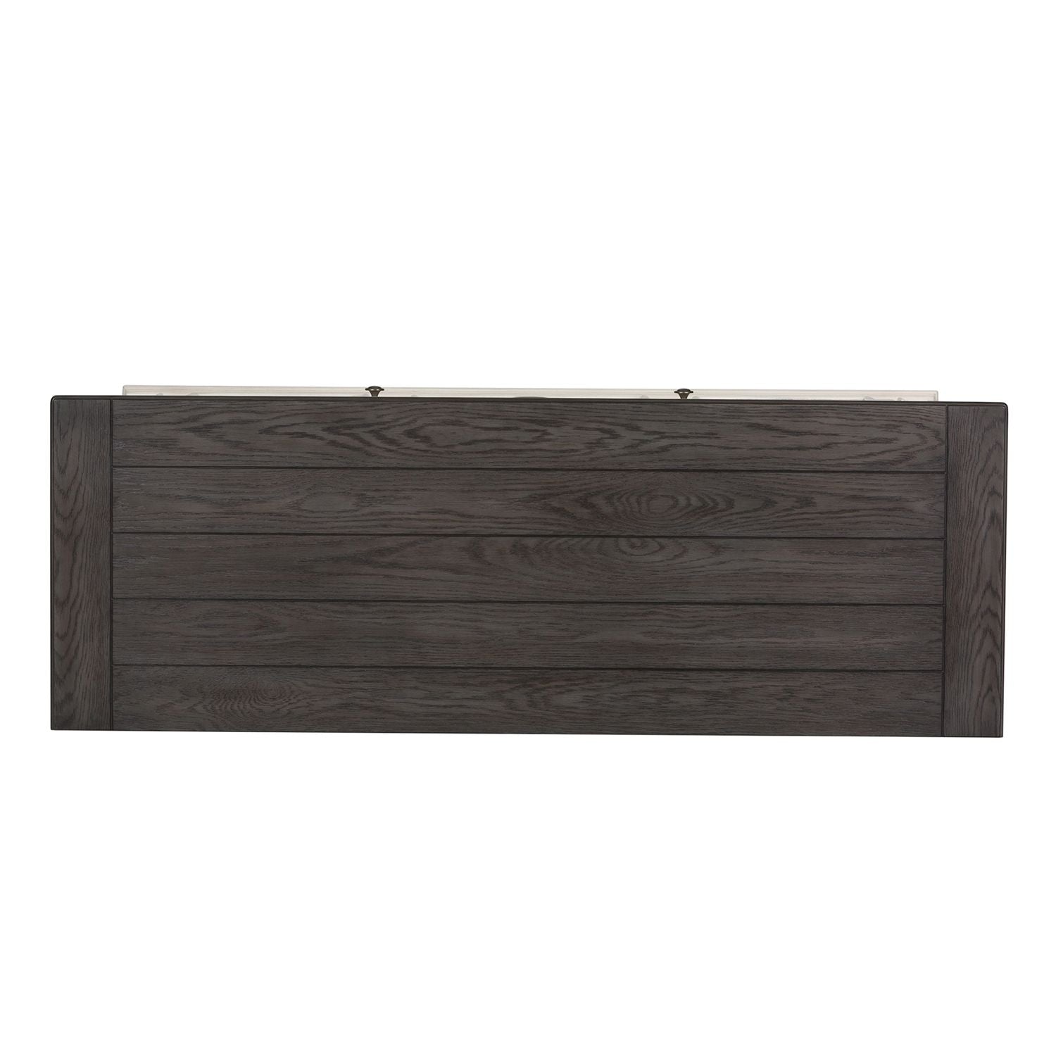 Reinvent your style with a memorable piece. The Allyson Park buffet is crafted of poplar and rubberwood solids with cathedral white oak tops and features a wire brushed charcoal planked top with a wire brushed white base that has brown undertones, all accented with antique pewter knob and drop bail hardware. This buffet has an open center shelf with wine storage flanked between two wood framed glass doors. Behind each door is one adjustable shelf. Three wood framed full extension drawers round out this piece, with the top two drawers being lined with felt. The Allyson Park buffet offers cottage styles you love that will work from the beach to the mountains to an industrial loft.