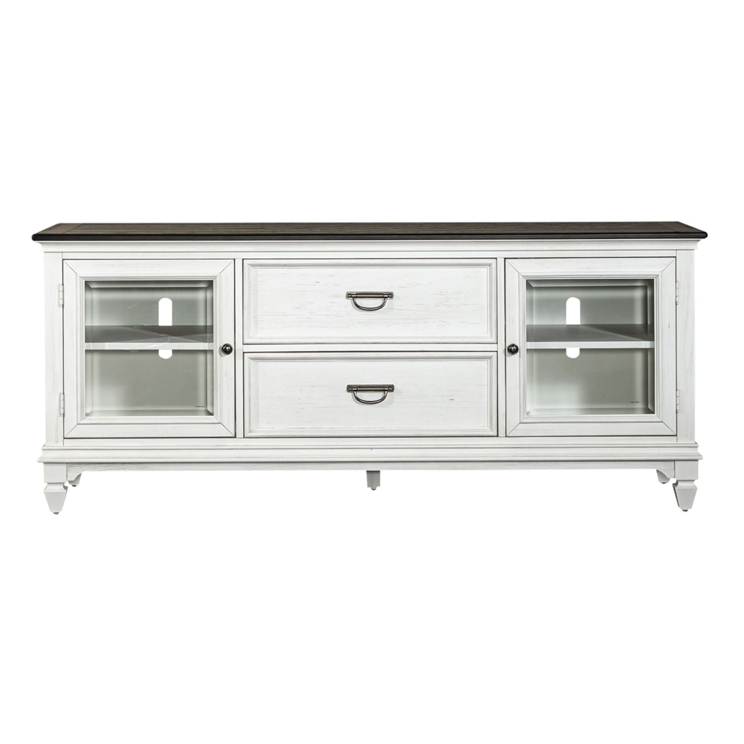 Indulge in a classic look and casual feel with the Allyson Park 72" tv stand. Crafted with pine solids and veneers with cathedral white oak tops, this piece features a wire brushed white finish with charcoal tops, antique pewter bail and knob hardware, adjustable shelving, planked tops, fully stained interior drawers, and beveled glass doors that allow controllers to work through the glass. This item can be used with the wall unit to complete the set, or stand-alone due to removeable magnetic return moldings and can accommodate most 80" TVs. Wire management provisions effortlessly accommodates a DVD player or gaming console of choice.