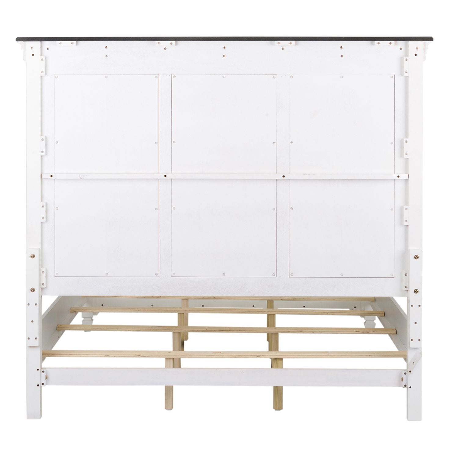 Create a classic look with a casual feel using the Allyson Park California king panel bed. The two-toned wire brushed white finish with charcoal tops creates a cottage style that works anywhere from the beach to the mountains. Crafted with pine solids and veneers with cathedral white oak tops, this piece features a center slat support system, bolt on rails, bead molding, and charcoal grey cap rails.