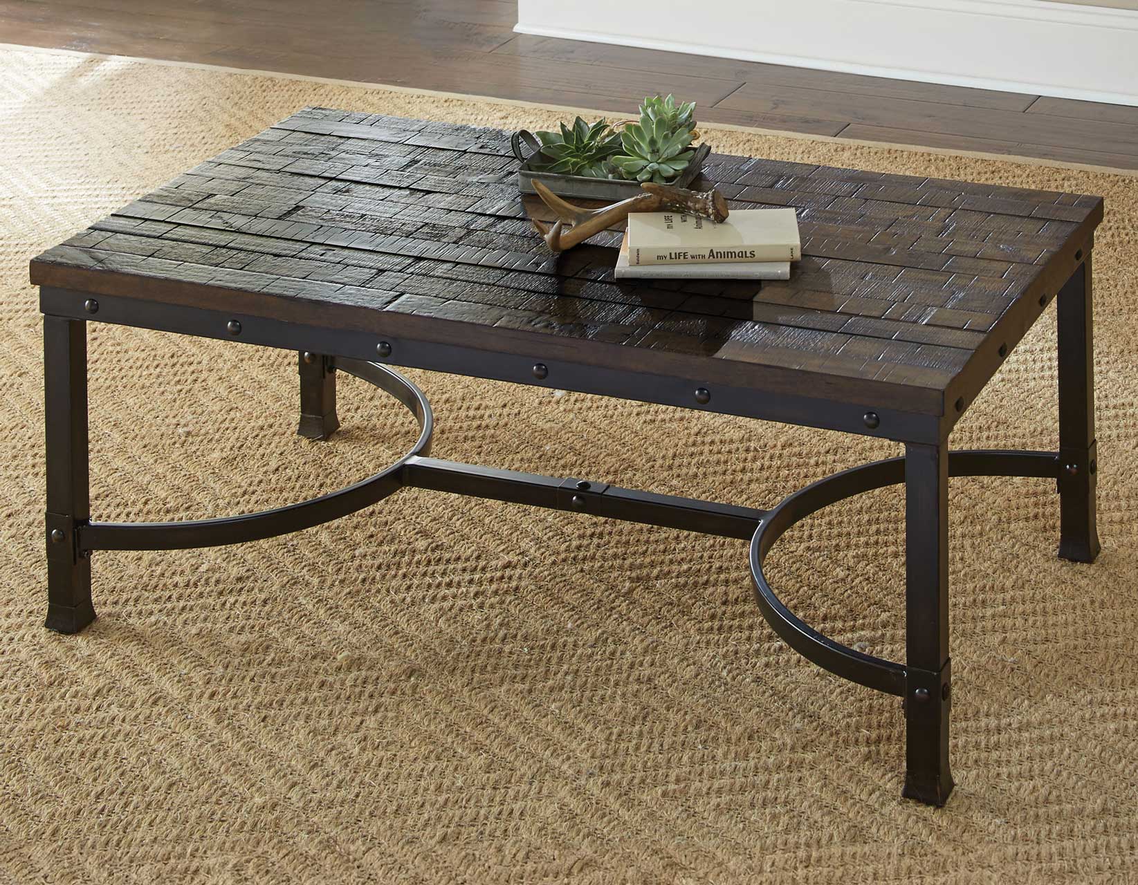 The Ambrose collection features a butcher block style wood surface that gives an aged and antiqued look. The rustic styling is accentuated by the dark iron legs and Demilune stretchers that connect in the middle. The distressed finish of the Ambrose cocktail table will easily blend with existing décor. Available for purchase separately is the matching end table. Your purchase includes one cocktail table.