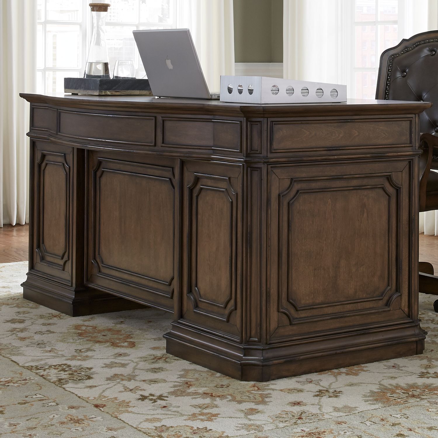 Work in style while working from home or the office with the Amelia Jr executive desk. Crafted of poplar solids and birch veneers, this piece features an antique toffee finish, seven full extension drawers for easy access to storage including two locking file drawers with bluff-cut drawer fronts to protect contents, fully stained interior drawers, framed drawer fronts with overlays, chamfered corners with soft concave shaping, a fancy face veneer top, and bead molding for enhanced detail. Amelia offers traditional styling that takes elements of the past and makes them relevant today.