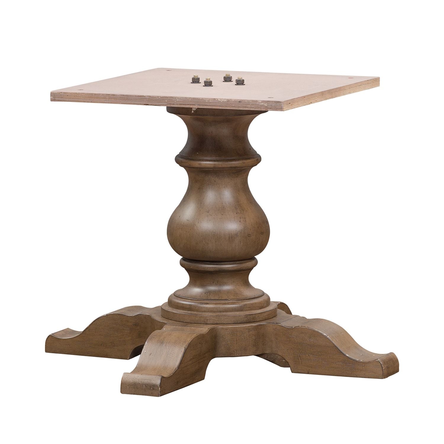 Be distinctively different with the Americana Farmhouse five-piece pedestal table set. Crafted of poplar and rubberwood solids with white oak veneers, this kit features a wire brushed dusty taupe finish with worm hole distressing and consists of the pedestal table and four upholstered shelter side chairs. The table has a fixed round top that is supported by a heavily turned pedestal flowing into bracket feet. The upholstered shelter chairs feature an upholstered tufted back panel with exposed wood framing for a deconstructed feel. The upholstery is highlighted by nail head trim and tapered legs with nylon chair glides to protect your flooring. Americana Farmhouse evokes a style unconstrained and intended to be personal with an authentic craftsman’s flair and artistry.