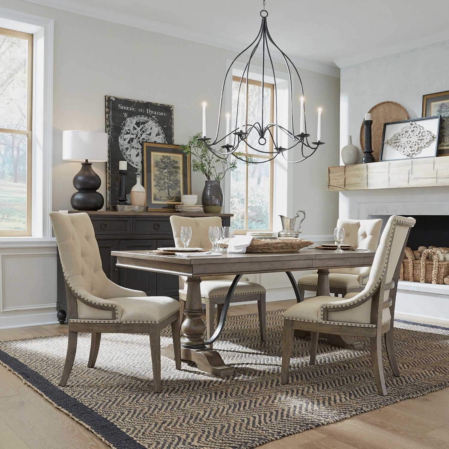 Be distinctively different with the Americana Farmhouse five-piece trestle table set. Crafted of poplar and rubberwood solids with white oak veneers, this kit features a wire brushed dusty taupe finish with worm hole distressing and consists of the trestle table and four upholstered shelter side chairs. The trestle table has appealing bead molding along the apron and includes a 24” removable leaf. There is an elegant metal stretcher at the base of the table that connects to the splayed wooden feet. The upholstered shelter chairs feature an upholstered tufted back panel with exposed wood framing for a deconstructed feel. The upholstery is highlighted by nail head trim and tapered legs with nylon chair glides to protect your flooring. Americana Farmhouse evokes a style unconstrained and intended to be personal with an authentic craftsman’s flair and artistry.