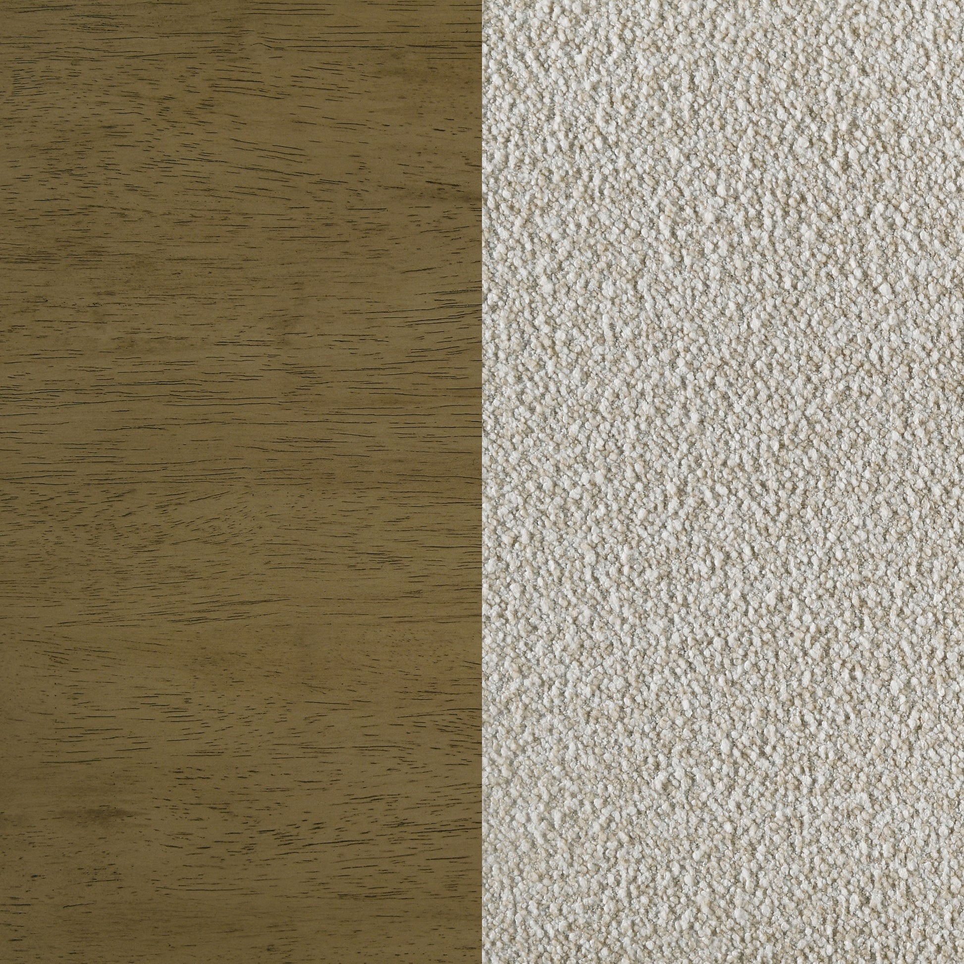 This panel bed brings a bold, modern touch to your bedroom with its clean lines and rounded corners. The warm nutmeg wood finish complements the vertical channels of the beige boucle upholstered headboard, creating a striking contrast between texture and tone. The bed's sleek design adds a contemporary flair while maintaining a minimalist profile. Crafted from solid rubberwood, this bed ensures durability and long-lasting beauty. Its frame offers a stable foundation for your mattress, providing both style and function.
