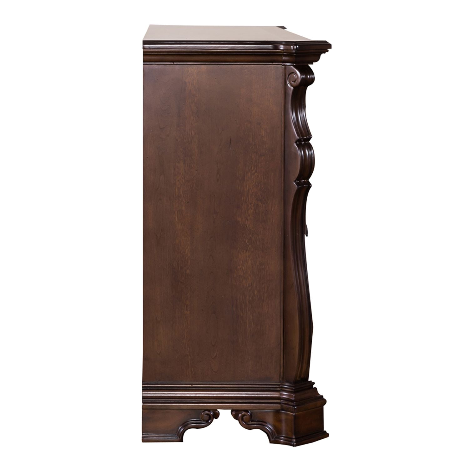 Add a statement piece to your room with this elegant 8-drawer dresser. The brownstone finish is accented by the burnished brass hardware as well as the four-way match fancy face veneer top. Organize your clothing using the 6 large drawers and 2 smaller hidden drawers, which are located beneath the top 2 drawers. Shaped pilasters create a subtle Bombay effect, highlighting the bold and remarkable scaling of the piece.