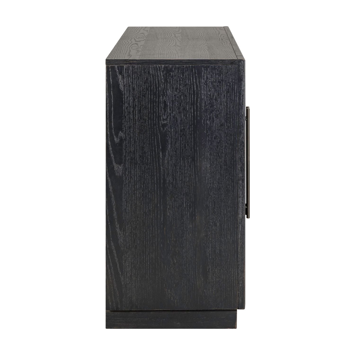 Elevate your space with the timeless elegance of the Archway 4 Door Accent Cabinet. Crafted of Rubberwood solids with Split Heart White Oak veneers in a sophisticated Charcoal finish, this cabinet features classic picture frame molding and a plinth-style base for a grounded, refined look. Four wood-framed glass doors showcase graceful archway shaping, offering a stylish view of the interior. Each set of doors is equipped with European soft-close hinges and magnetic catches, opening to reveal a spacious adjustable wood shelf and convenient wire management provisions—perfect for blending storage, display, and media functionality in one beautifully crafted piece.