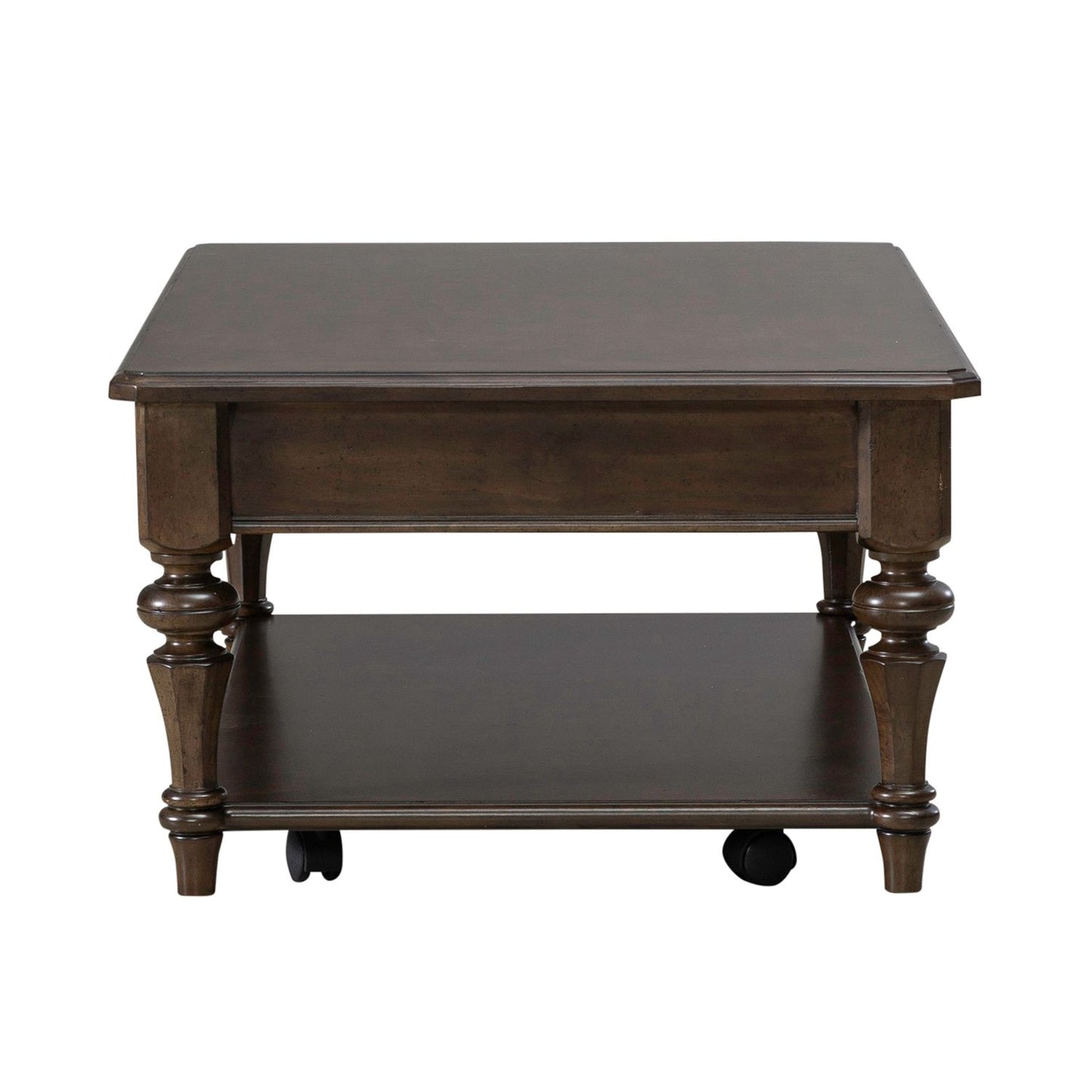 Give your home a personal touch that reflects your passions and personality with the Arden Road rectangular cocktail table. Meticulously crafted using Poplar solids and Rustic Alder veneers, this piece features a Satin Cherry finish. The table boasts canted corners and a breadboard veneer top, creating an aesthetic that is both timeless and contemporary. The canted corners add a touch of architectural interest, elevating the table’s visual appeal. The breadboard veneer top, with its meticulous craftsmanship, adds a layer of authenticity, inviting tactile exploration and highlighting the table’s attention to detail. A standout feature of the Arden Road rectangular cocktail table is the one interior storage drawer, a discreet and convenient solution for stowing away essentials, keeping your living space organized and clutter free. The drawer embodies both practicality and style, offering a seamless blend of form and function, and is accented with Antique Brass knob hardware. Bead molding runs along the base of the apron, adding a touch of classic detailing that ties the design together. This thoughtful accent enhances the table’s overall aesthetic, creating a sense of cohesion and refinement. The ball and vase faceted turned legs are a testament to the traditional craftsmanship, providing both stability and a touch of vintage charm. These elegant legs flow seamlessly to the open bottom shelf, offering additional space for storage or displaying your favorite items. The combination of the ball and vase faceted turned legs with bead molding creates a sense of grace and symmetry. Functionality meets style with the addition of casters, providing easy mobility when needed. Whether you’re rearranging your living space or hosting guests, the casters ensure that this cocktail table effortlessly adapts to your dynamic lifestyle. The perfect addition to your living room, the Arden Road rectangular cocktail table combines classic design elements, modern convenience, and a touch of vintage charm.