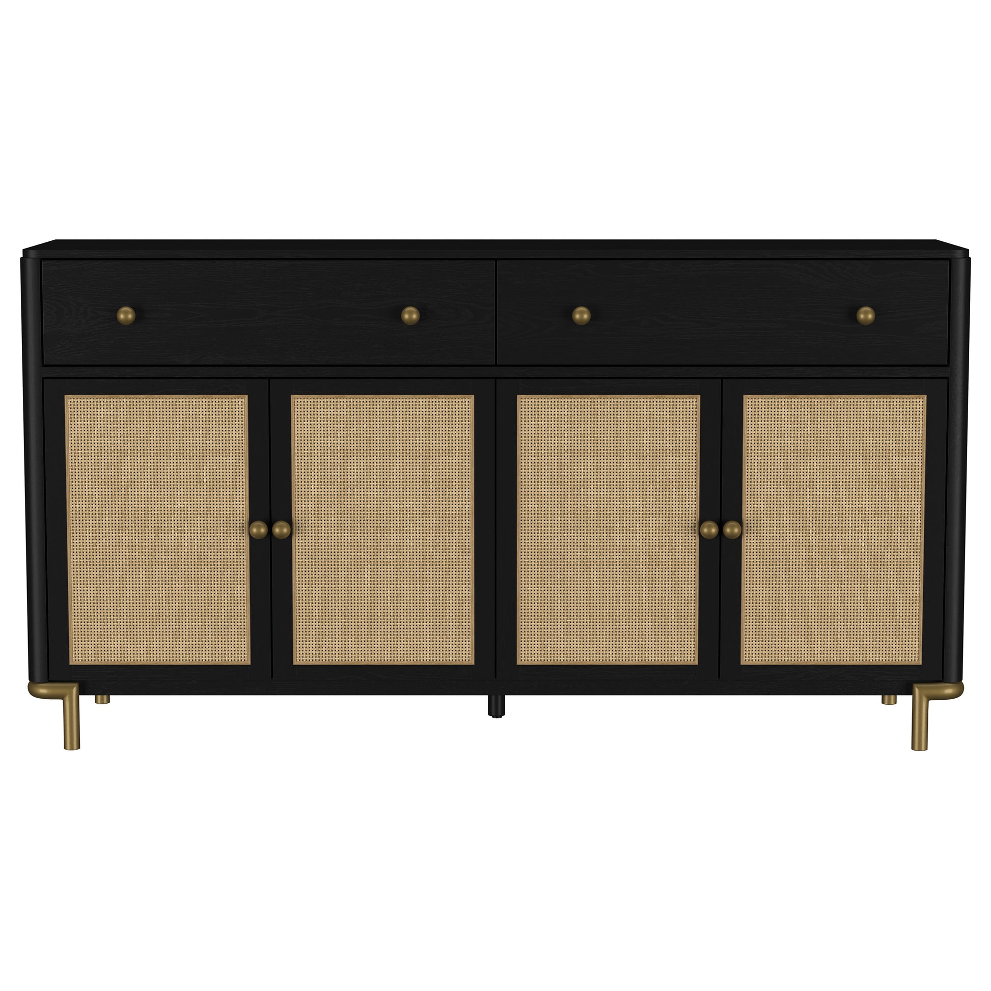 This 65-inch sideboard combines modern sophistication with organic charm and exceptional functionality. Featuring handcrafted woven cane door panels from Indonesia, it adds natural texture to any space. Constructed from solid rubberwood and white ash veneer, its refined craftsmanship is enhanced by a 17-step finishing process. Felt-lined drawers with English dovetail construction glide smoothly on 45mm metal ball-bearing tracks, while soft-close Euro-hinged doors and adjustable shelves offer practical storage. Antique brass knobs and legs complete the elegant design.