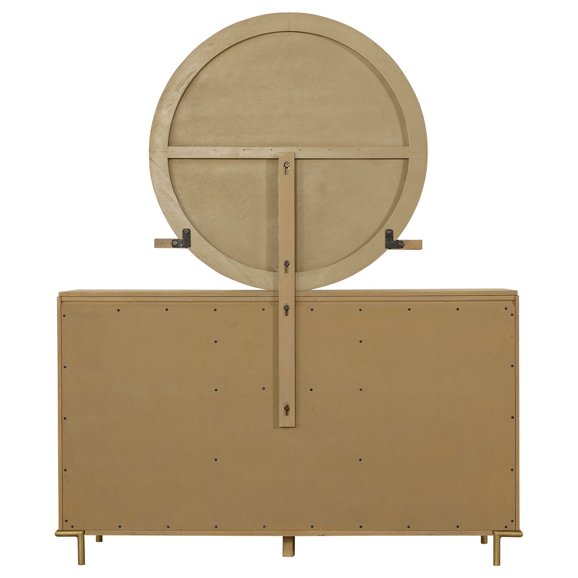 This mid-century modern dresser and mirror set blends elegant design with versatile functionality. The eight-drawer dresser features a wire-brushed sand wash finish, aged brass knobs, and slender metal legs for a refined touch. Felt-lined top drawers offer safe storage for delicate items, while softly rounded corners add subtle sophistication. Above, the round mirror includes a felt-lined tray and can be mounted to the dresser or hung independently on the wall, offering flexible styling and practical beauty for any bedroom.