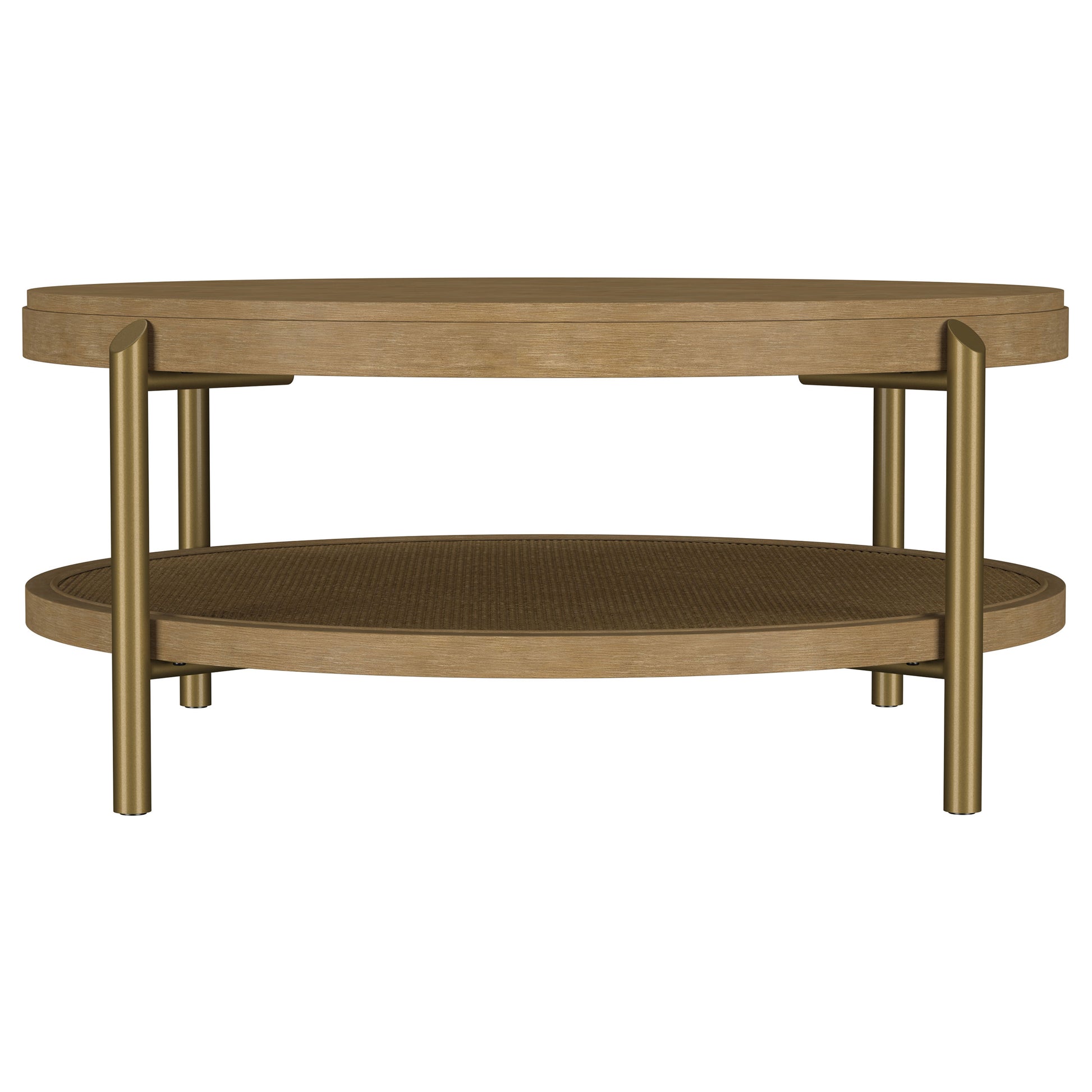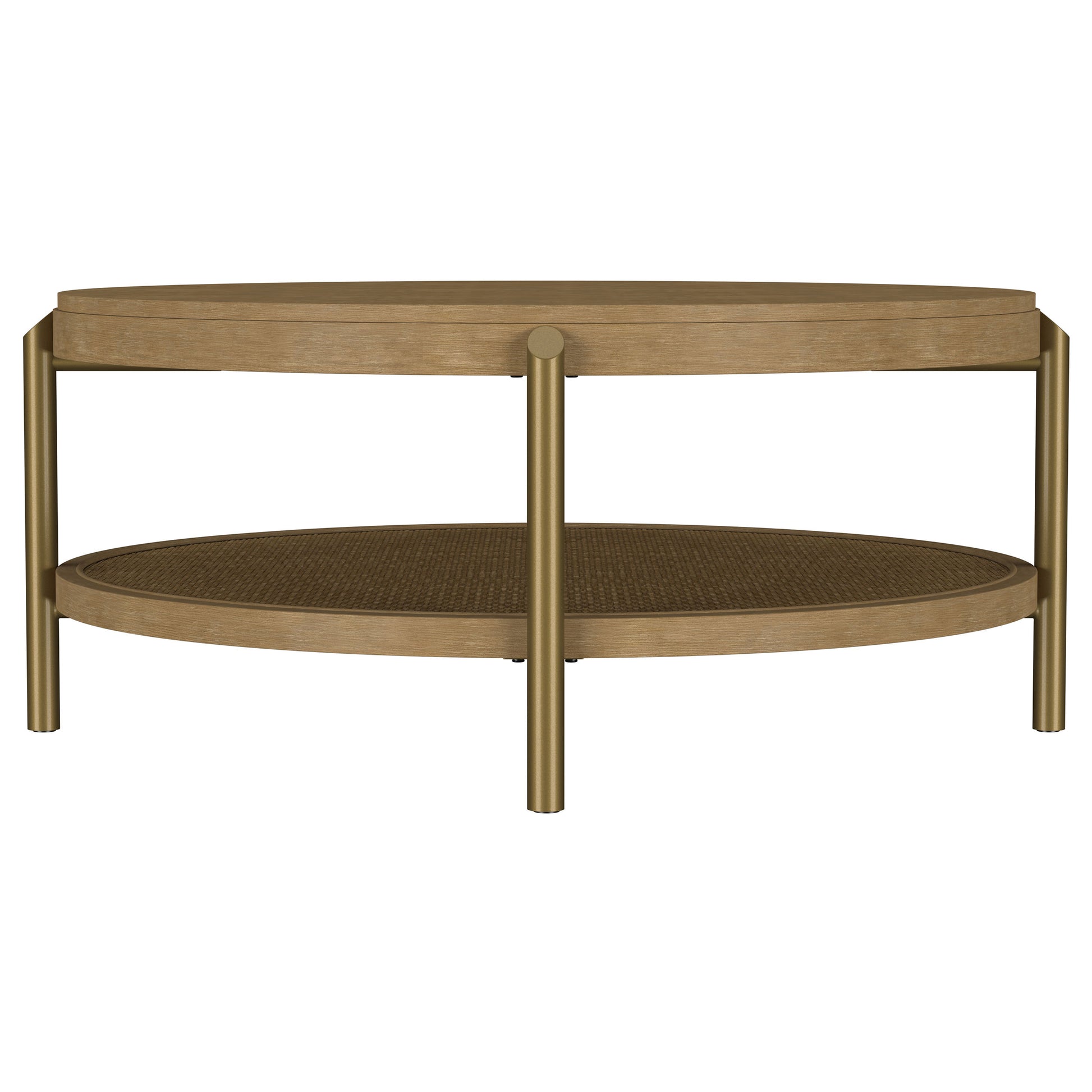 This round coffee table combines modern design with rustic charm, perfect for today’s living spaces. Crafted with rubberwood, engineered wood, and ash veneer, its smooth finish highlights the natural wood grain for an organic appeal. The lower shelf features woven rattan, offering practical storage and a textured look. Supported by aged brass-finished metal legs, this cocktail table delivers a balance of durability and style, serving as a functional centerpiece for any living room or lounge area.