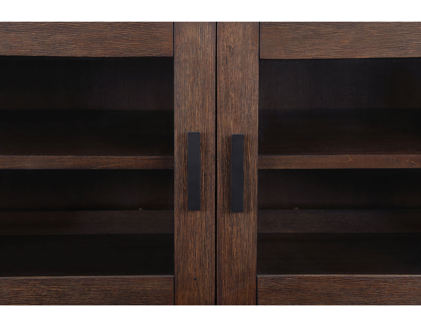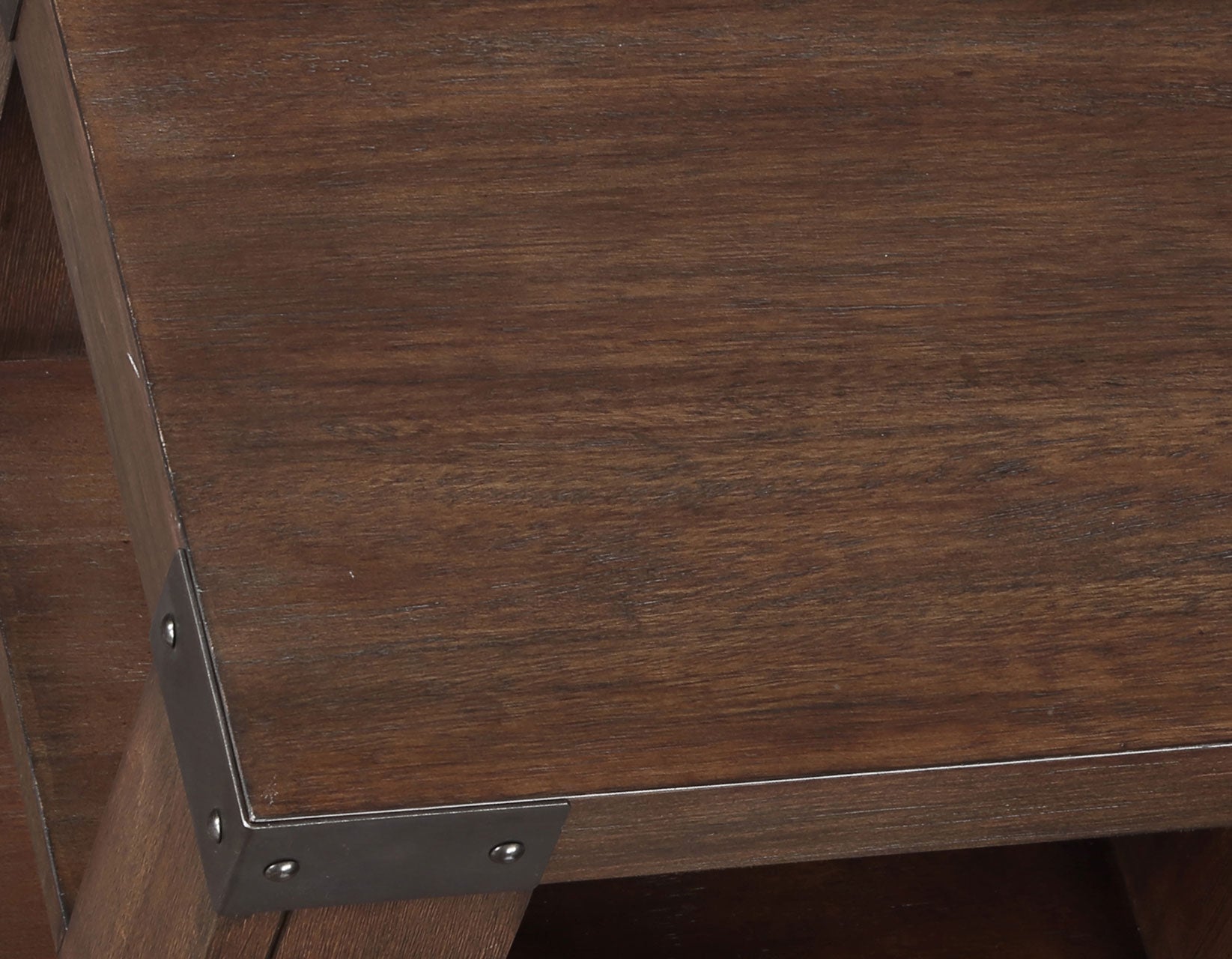 The Arusha TV Stand effortlessly blends rustic style with modern amenities. A rich medium cherry finish is accented by riveted black metal brackets and distressed wood scoring for a beautiful home entertainment hearth that will balance and center any room. The low-profile design places your television at the perfect viewing angle while offering a combination of fixed and adjustable shelves ample space for electronic storage, all while ensuring open sight lines for uninterrupted remote signal access. This stand serves not just as a home for your TV, but as a harmonious centerpiece for any room.
