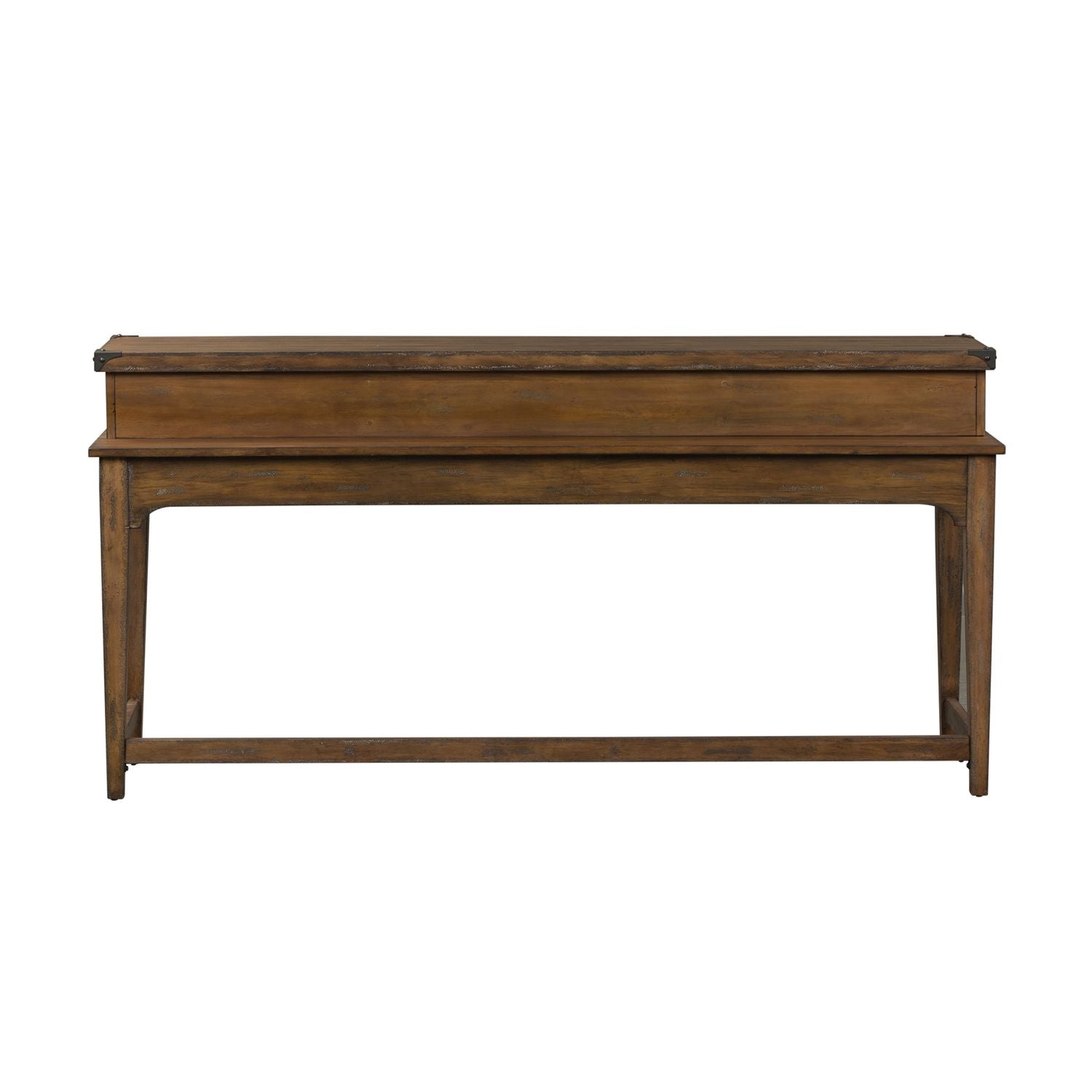 Design possibilities are endless with Aspen Skies works with styles from rustic to farmhouse. Crafted of pine solids and New Zealand pine veneers in a weathered brown finish with metal accent. Features planked tops with metal corner accents and nail heads, cut outs beneath the top for additional storage and round swivel stools upholstered in a brown microfiber material for cleanability with accent nail heads. Perfect behind the sofa or a kitchen nook. Kit consists of one console bar table and three swivel stools. Also available in a russet brown finish.