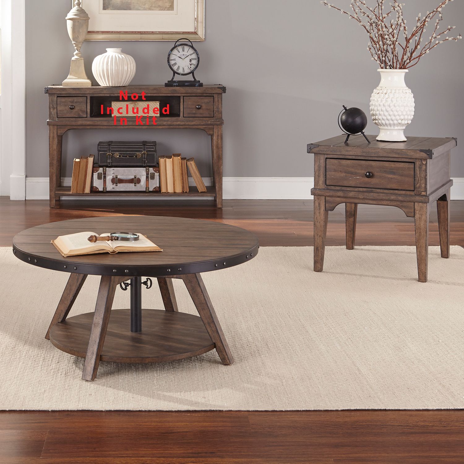 Design possibilities are endless with Aspen Skies works with styles from rustic to farmhouse. Crafted of pine solids and New Zealand pine veneers in a weathered brown finish with metal accent. Features planked tops with corner and body metal strap accents with nail heads. Trunk features casters, bracket feet full cedar lining inside with a trey for smaller items. End tables offer tapered legs with one drawer. This traditionally designed collection will add warmth and charm to any room in the house. Kit consists of one motion cocktail table and two end tables. Also available in a russet brown finish.