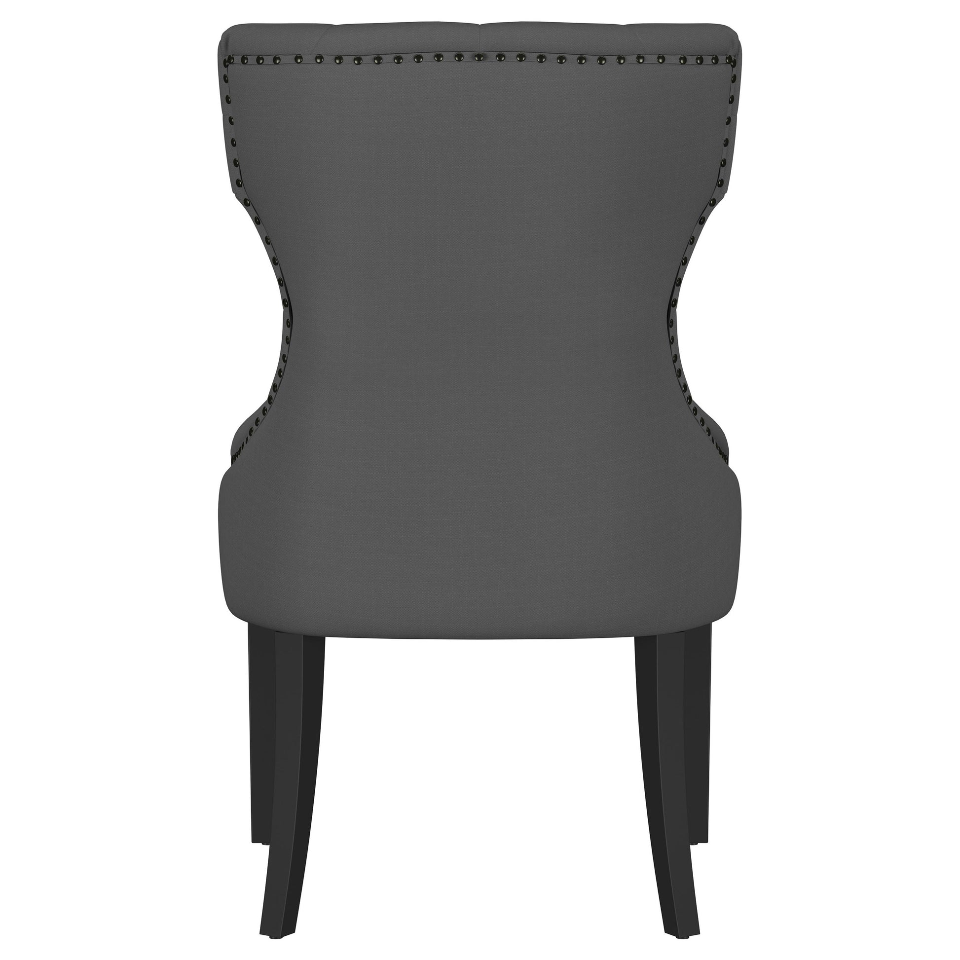 Create an exceptional, inviting dining room space with a modern button tufted dining chair. It pairs a classic wingback profile with a gentle curvature, offering impeccable comfort and chic style. Its plush back and seat feature foam cushioning with soft upholstery, delivering indulgent seating experiences to all who dine at your table. The back of the chair includes nailhead trim that adds a dimensional finishing touch. Black finish legs complete the look with austerity and excellent support.