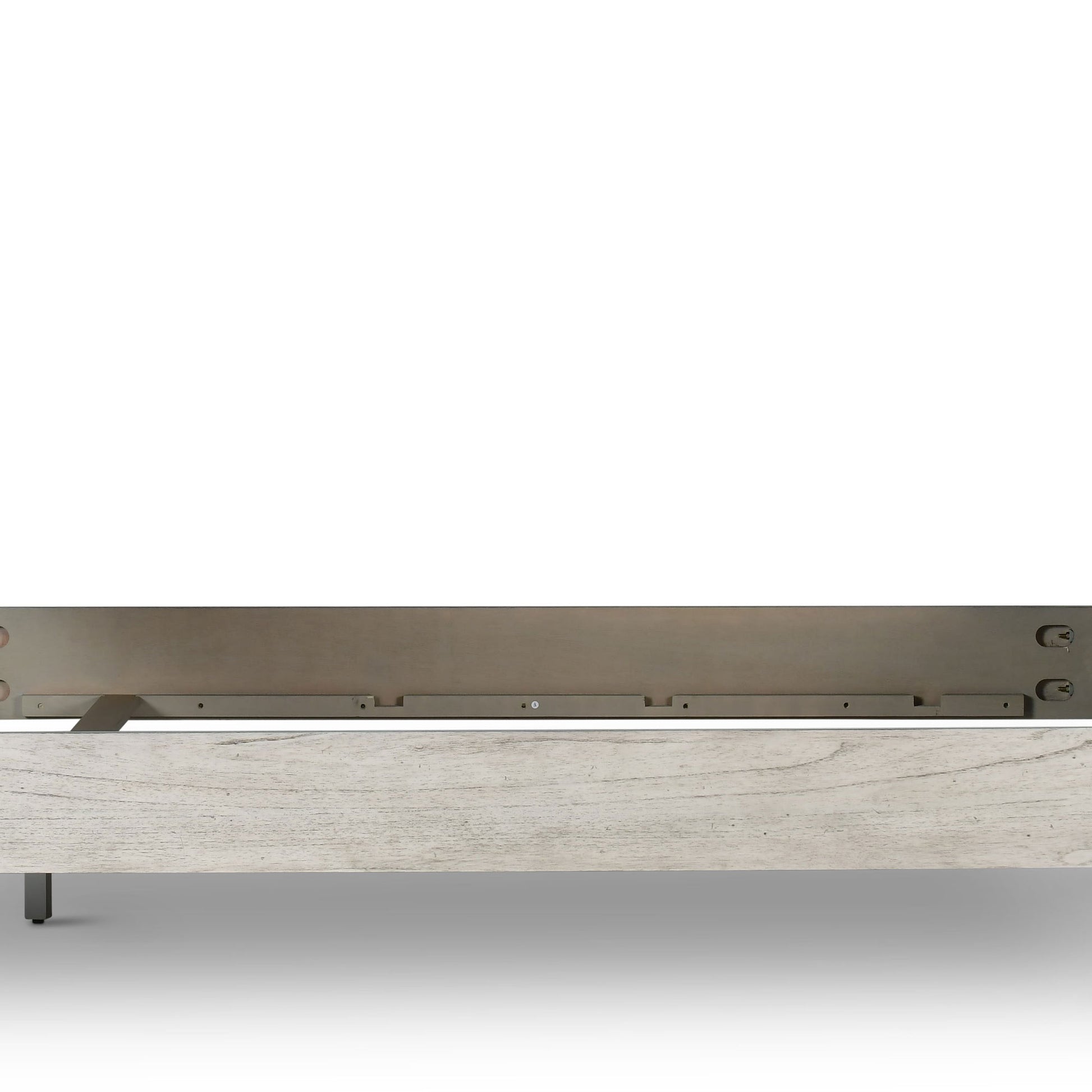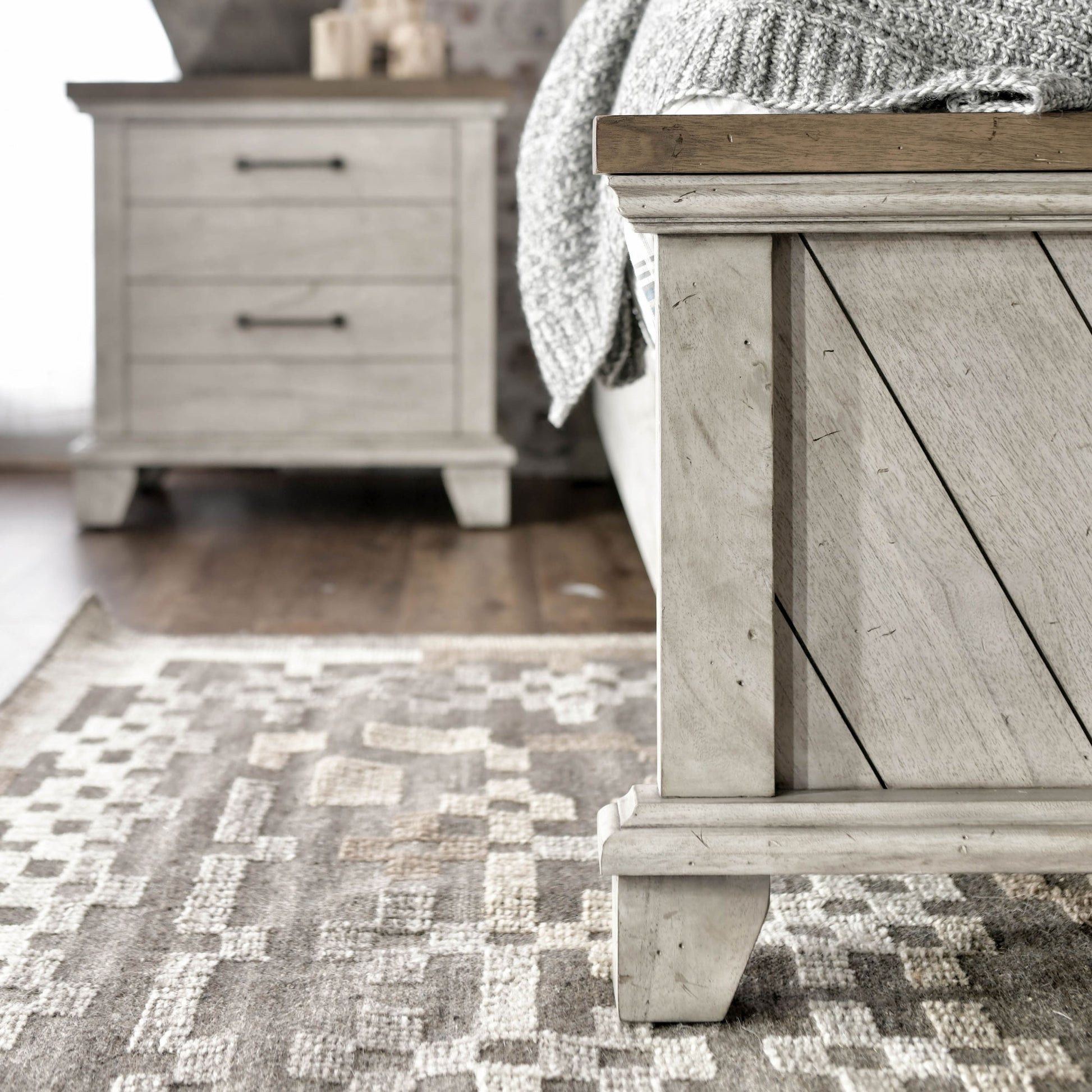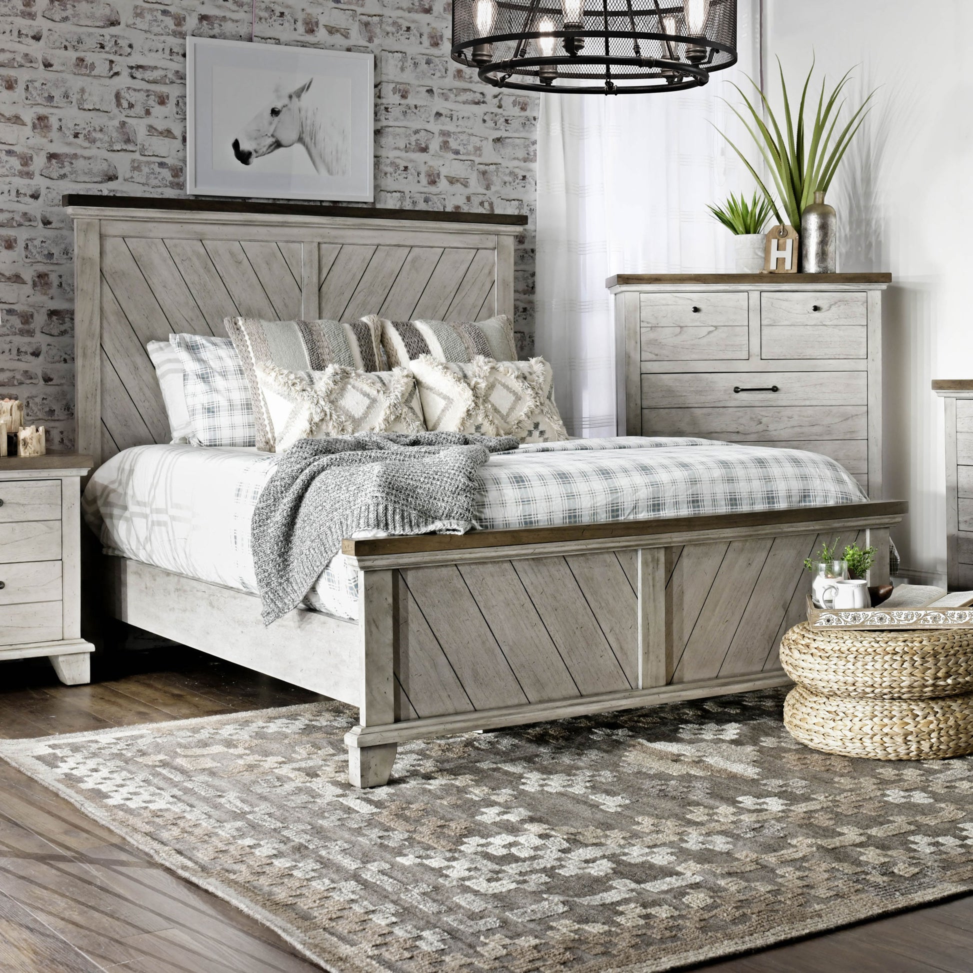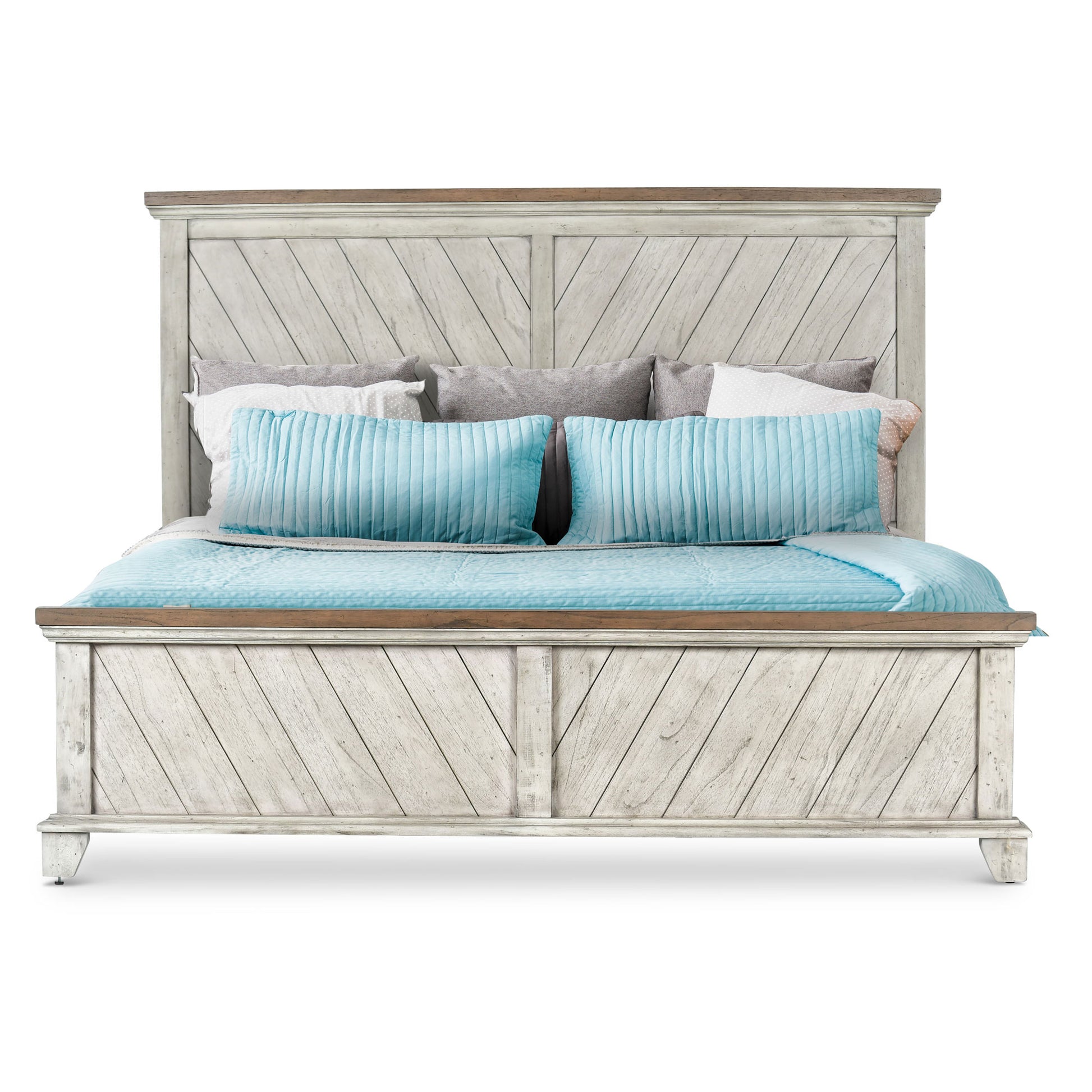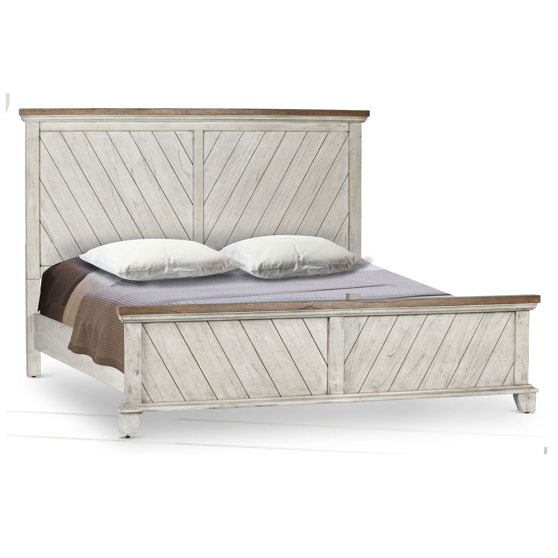 A rustic, farmhouse-inspired bed, Bear Creek features a white-smoke finish that contrasts beautifully with honey-smoke stained tops and cap rails. The chevron patterned headboard and footboard is offered in California King. Mix with the regular line Bear Creek case goods for a variety of storage items with ultra-deep drawers supported by side drawer glides for easy operation.