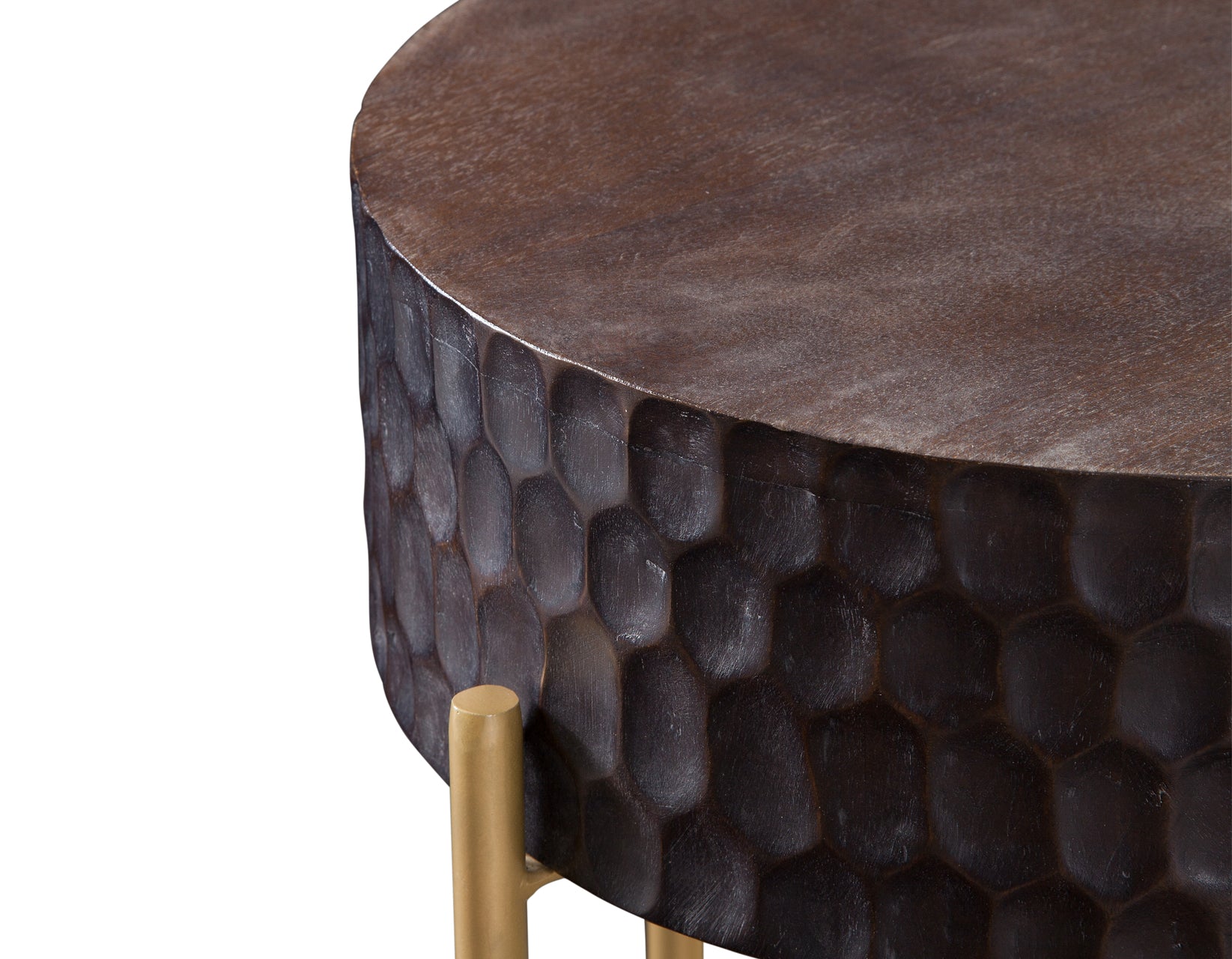 The Bobbi Collection blends artisanal texture with modern sophistication for a bold design statement. Crafted from solid mango wood, the Coffee Table and End Table feature hand-sculpted honeycomb sides that highlight the natural grain, finished in burnished espresso. A matte brass iron base offers striking contrast and stability, with a cross-stretchered design for sturdy support. The powder-coated metal resists wear, while kiln-dried wood reduces warping and cracking. Whether styled together or separately, Bobbi pieces bring refined craftsmanship to modern, industrial, or transitional spaces.