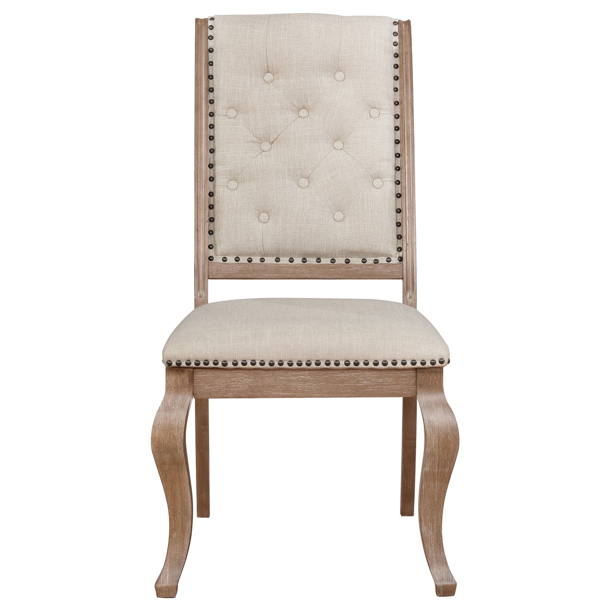 Gracefully blending traditional warmth with modern refinement, this dining set offers timeless sophistication for any dining room. The rectangular dining table showcases a natural barley brown finish and includes a removable twenty-inch extension leaf for adaptable seating. Its dual pedestal trestle base provides stability and sculptural beauty. Coordinating upholstered chairs in soft cream fabric feature elegant button tufting, curved legs, and nailhead trim, completing this exquisite transitional ensemble.