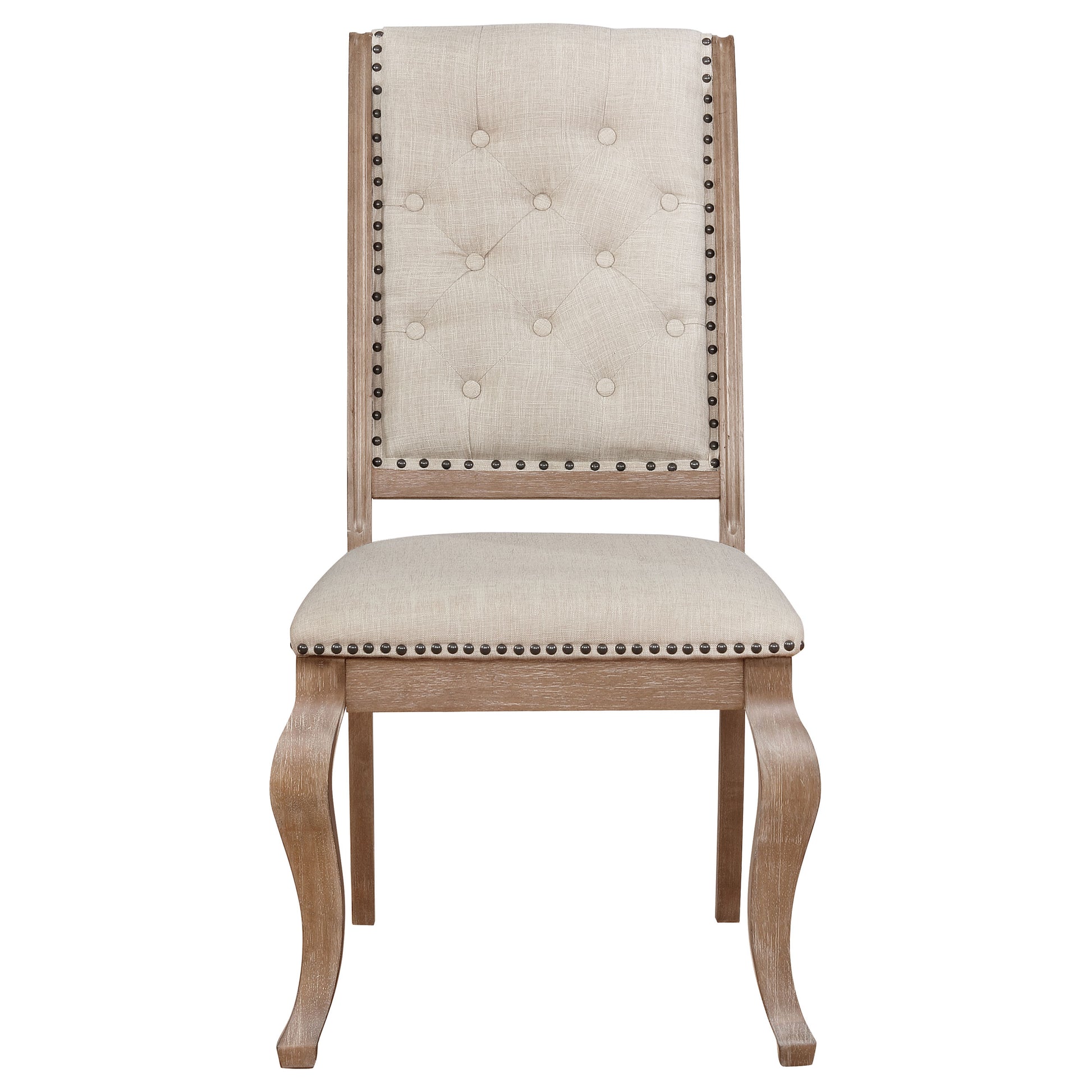 Graceful and inviting, this upholstered dining chair pairs timeless design with modern comfort. The gently curved legs and tufted backrest create a refined silhouette, while bronze nail head trim adds a subtle touch of sophistication. Its cream-toned upholstery offers a soft, neutral contrast to the barley brown wood frame. Crafted from solid rubberwood and foam cushioning, this elegant side chair combines durability and plush comfort, perfect for both formal dining occasions and daily family meals.