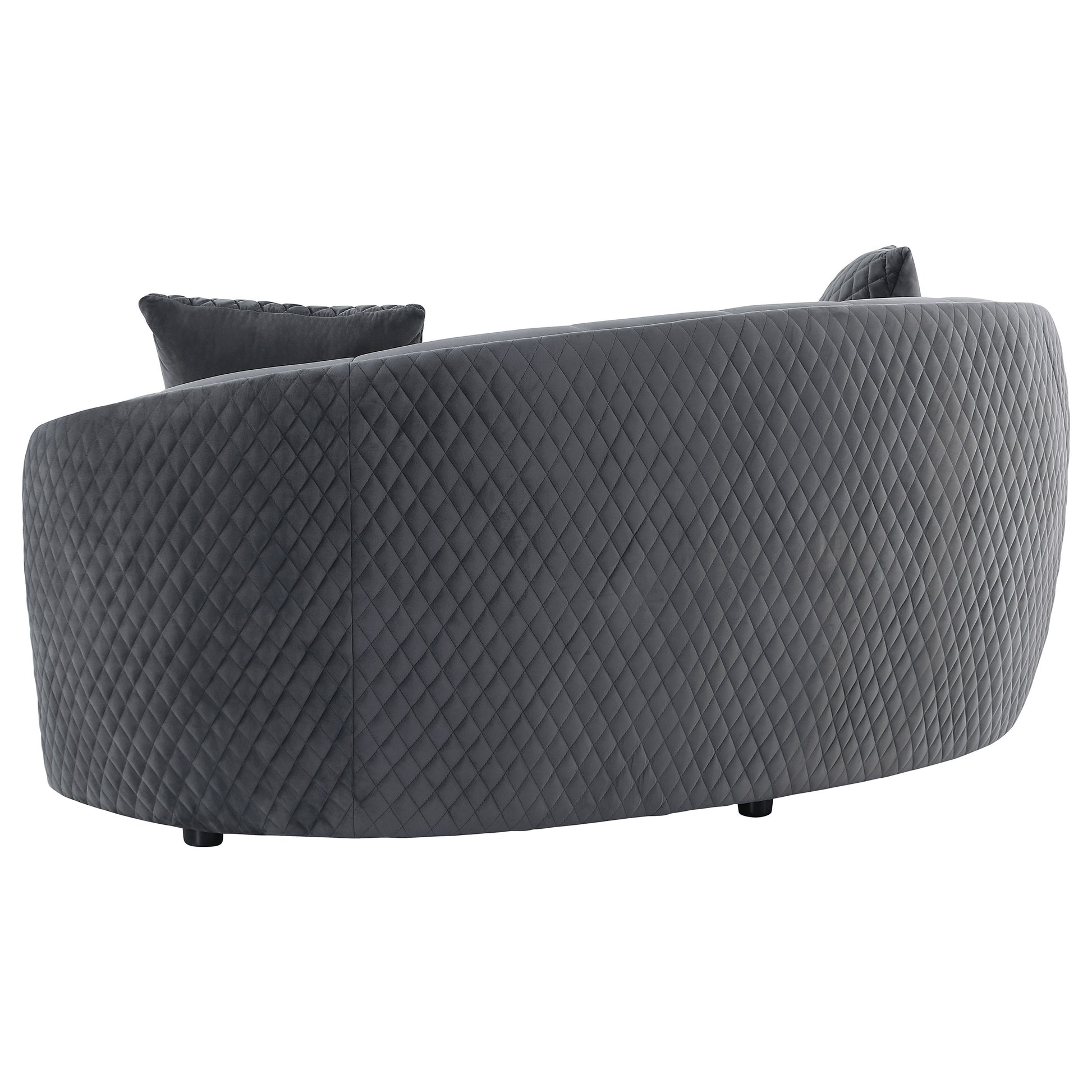• Diamond tufting adds depth the outer surface of a modern upholstered sofa set in dark grey