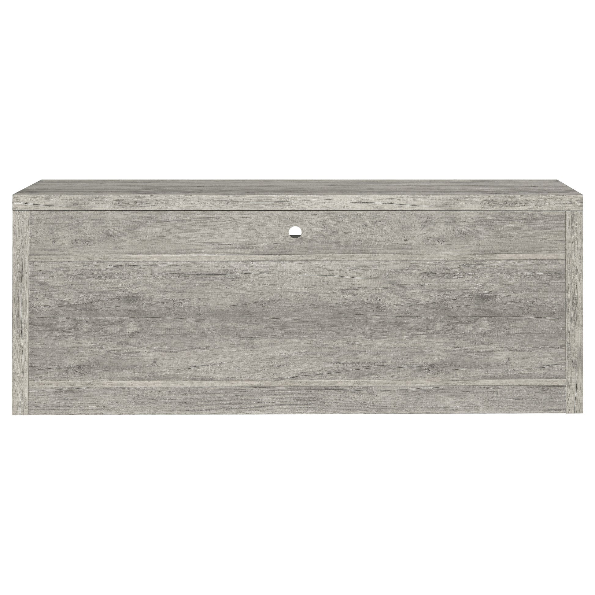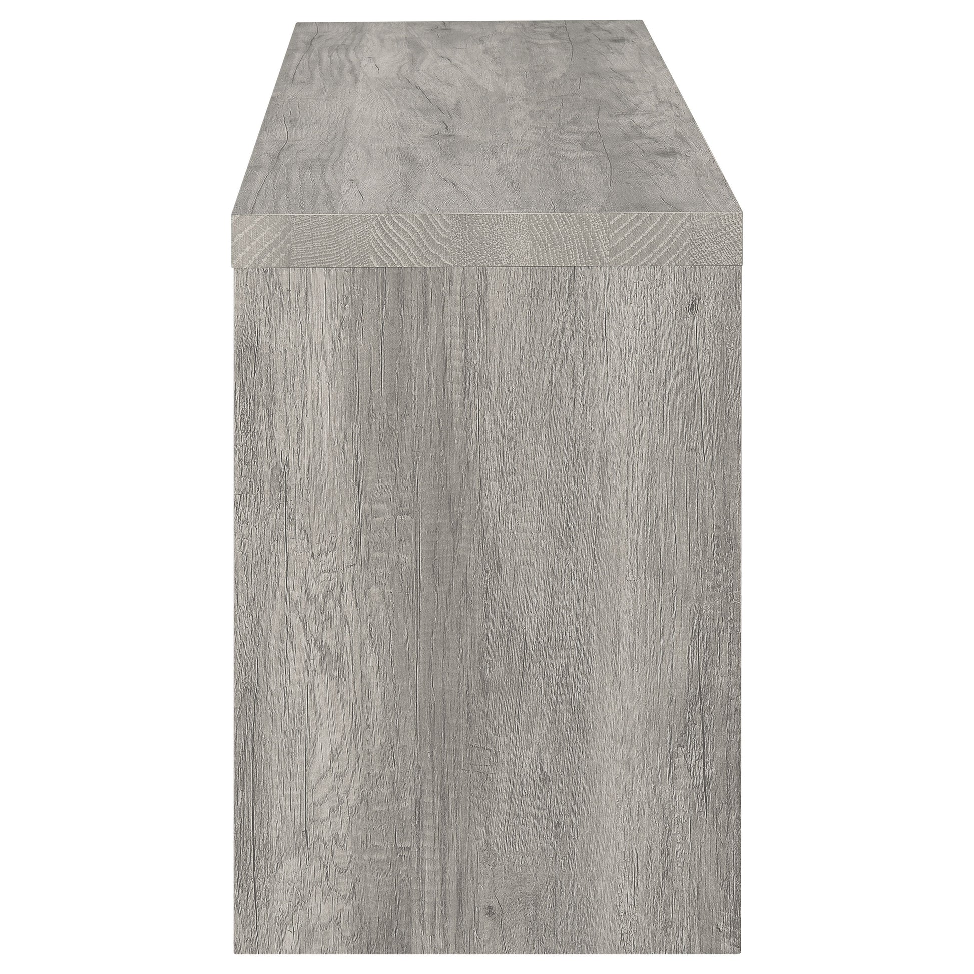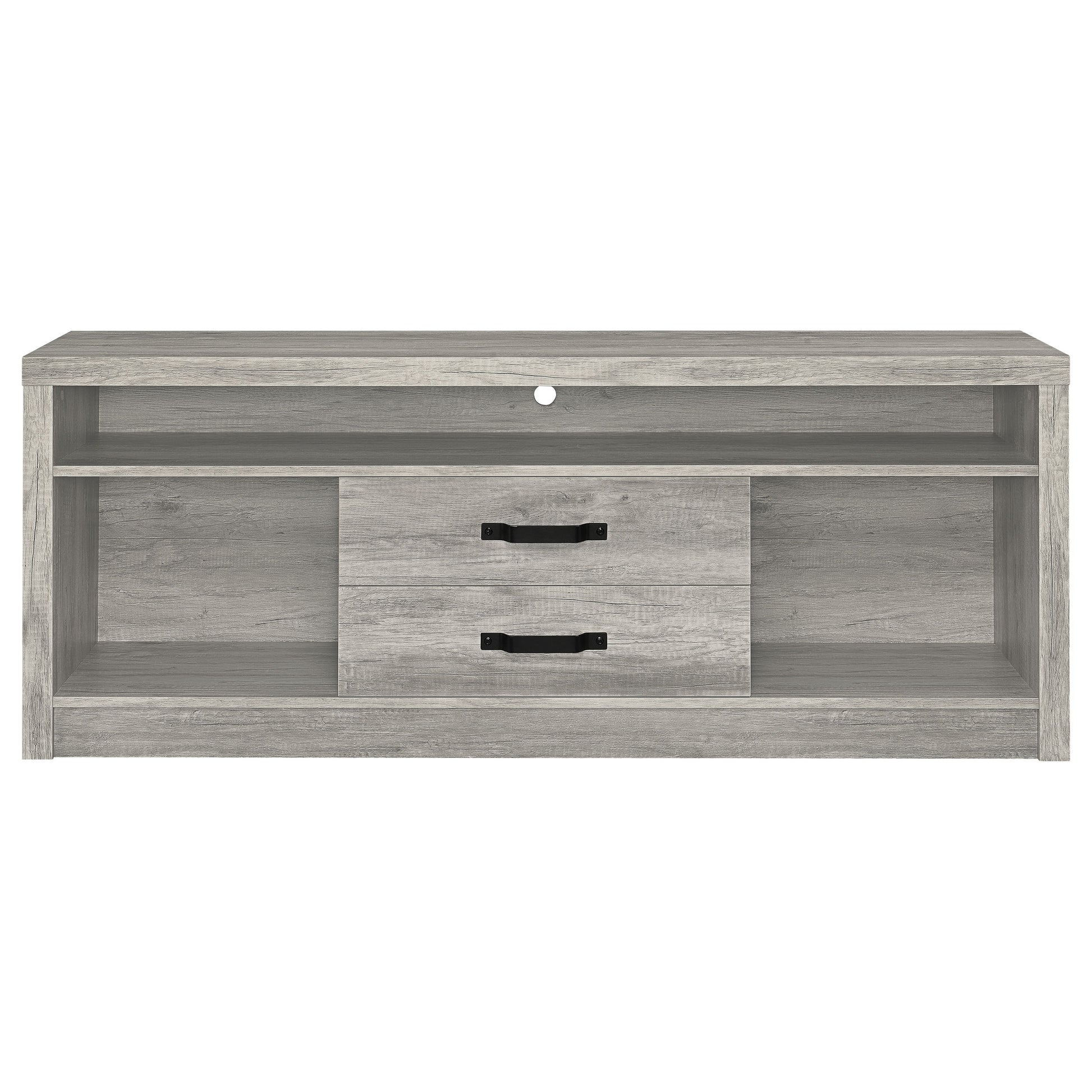 Elevate your living space with this sleek 59-inch TV stand that combines clean lines and versatile storage. A modern grey driftwood finish adds a light, airy feel to any entertainment area. Designed to accommodate TVs up to 65 inches, it features a wide top shelf, two open side compartments, and dual drawers with black hardware for contrast. Perfect for organizing devices, décor, and accessories, this stand is crafted from engineered wood with a durable laminate veneer for lasting style.
