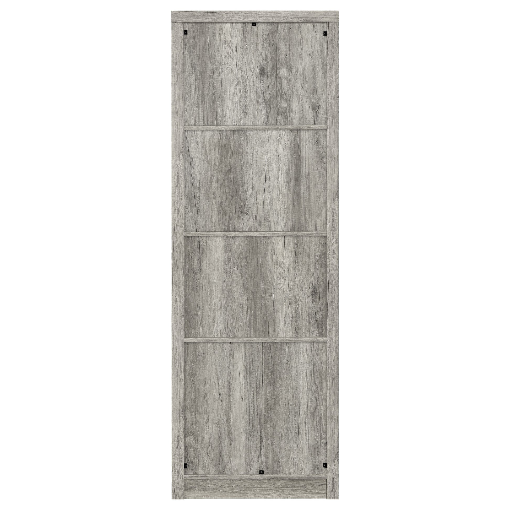 Tall and slender, this modern media tower is the perfect complement for your entertaining needs in both compact and larger spaces. Organize media, books, and implements on shelves and interior shelves, staying organized and uncluttered. Melamine construction features a distressed weathered gray finish with grain-like markings, offering rustic vibes. Find space on three fixed shelves and one adjustable shelf, all ready to separate and store gaming supplies, media, or books. A single black finished metal hardware pull offers an ideal match.