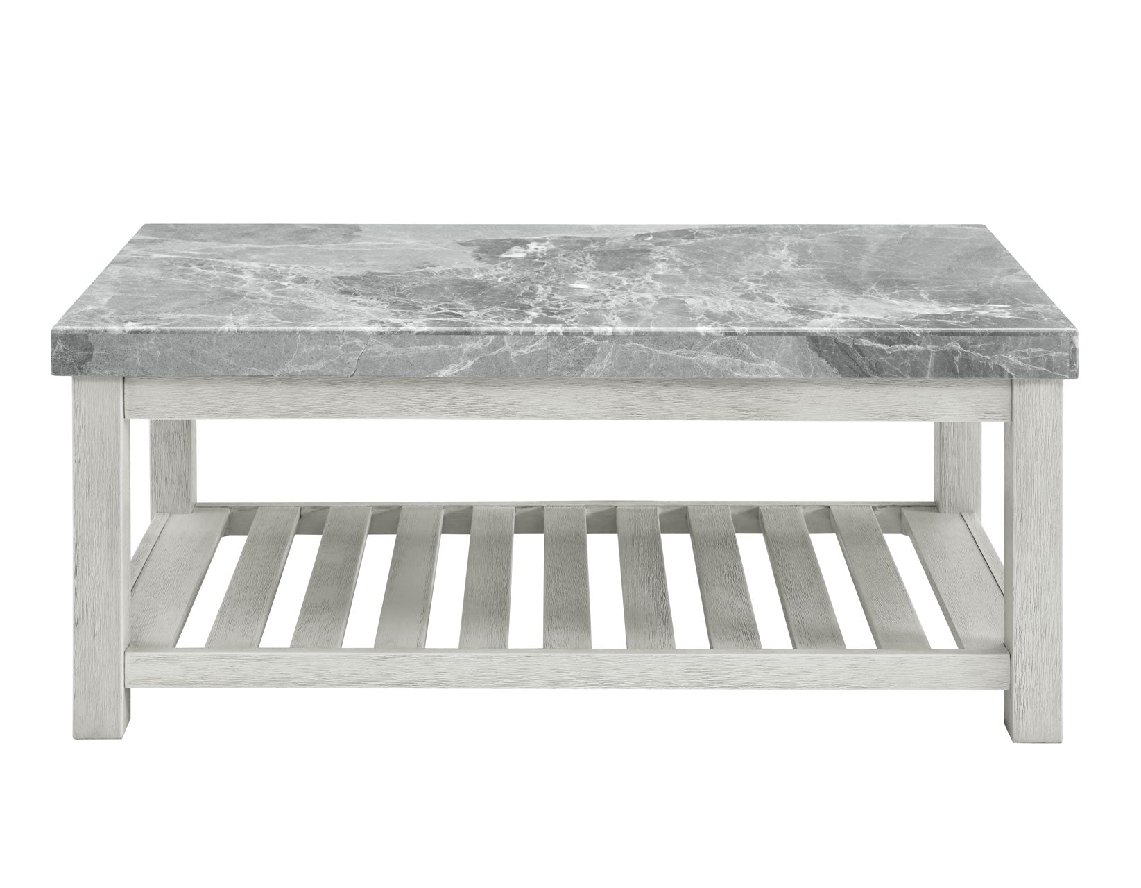 A light and airy centerpiece to any living area, Canova offers the elegance of a marble top table in a more relaxed presentation. A gray marble top veneered offers a subtle contrast to the substantial legs and slotted shelf in a streamlined look that creates a bold profile to center a room. The Cathedral White finish over Ash Veneers and Poplar solids create a neutral but not demure aesthetic that is perfect for Coastal, Farmhouse, Transitional or just open and airy interiors.