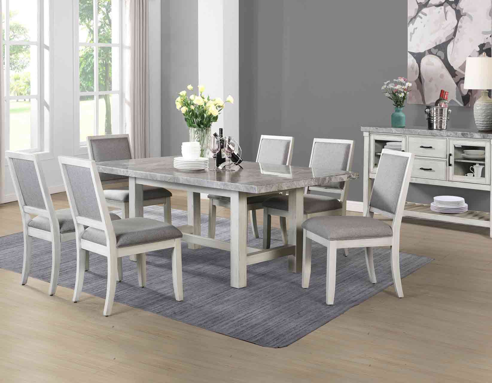 A casually elegant Server in a neutral palette, Canova fits the bill as a dining companion piece. A Cathedral White wood finish pairs beautifully with the solid gray marble veneer in a piece that can be used in classic, contemporary or farmhouse decors. Glass doors allow for a display area or can be used for electronics and remotes in an entertainment package.