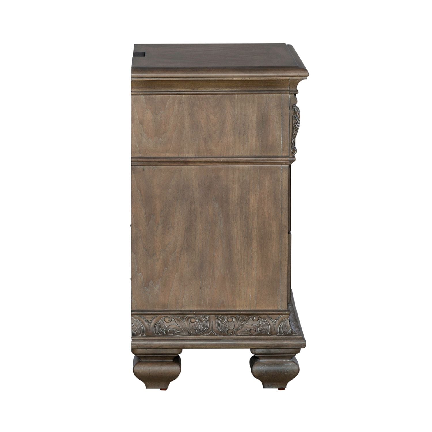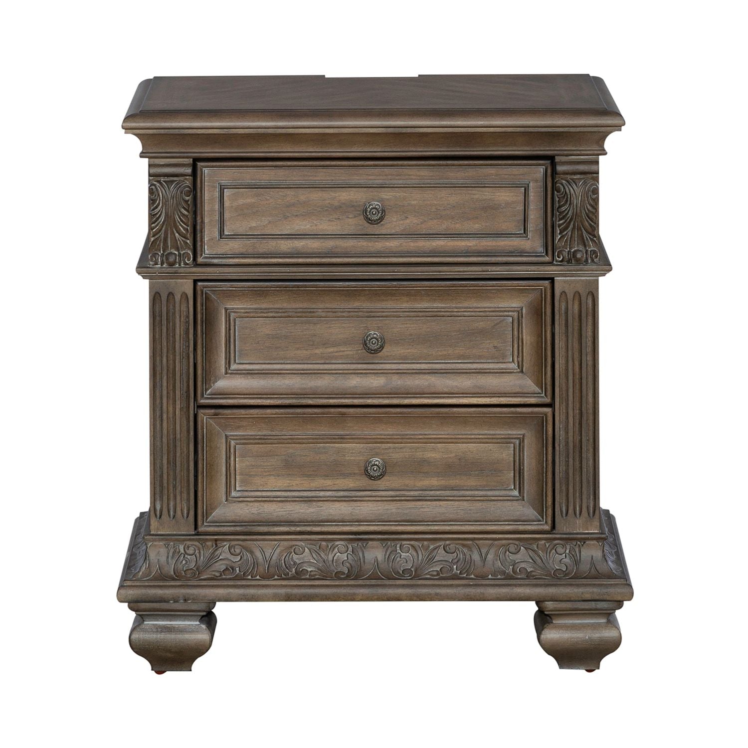 Indulge in luxury with the Carlisle Court three drawer nightstand with charging station. Crafted with excellence using rubberwood solids and rustic hickory veneers, this nightstand features a Chestnut with Gray Dusty Wax finish. The carved corbels accent fluted pilasters. The base features acanthus leaf carvings and square turned bun feet. There are three full extension drawers that are great for storage. The drawer fronts are wood framed and feature bead molding for added dimension and are accented with Antique Brass knob hardware. The top drawer is felt lined, and the bottom drawer is lined with cedar. Utilize the convenience of the built-in charging station complete with two electrical outlets and two USB ports. Combine the grand feel of the past with today’s luxurious lifestyle with the Carlisle Court three drawer nightstand with charging station.