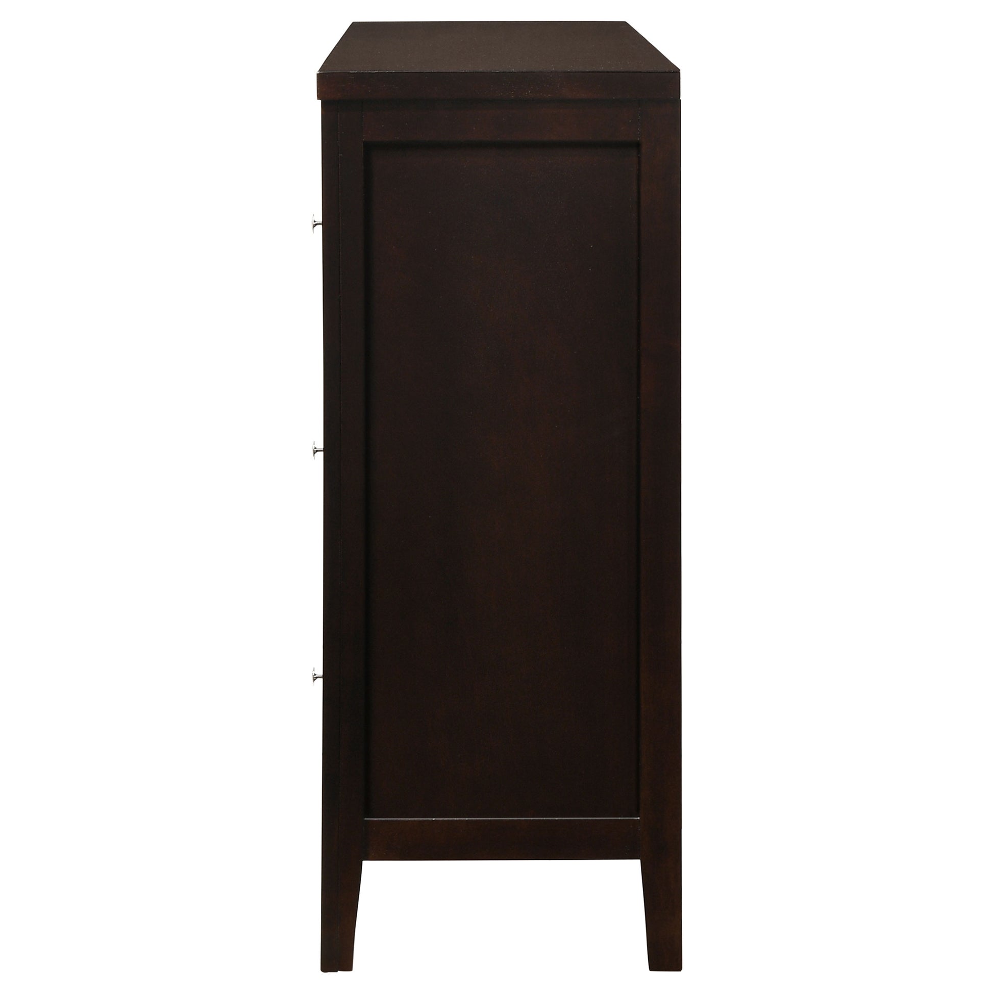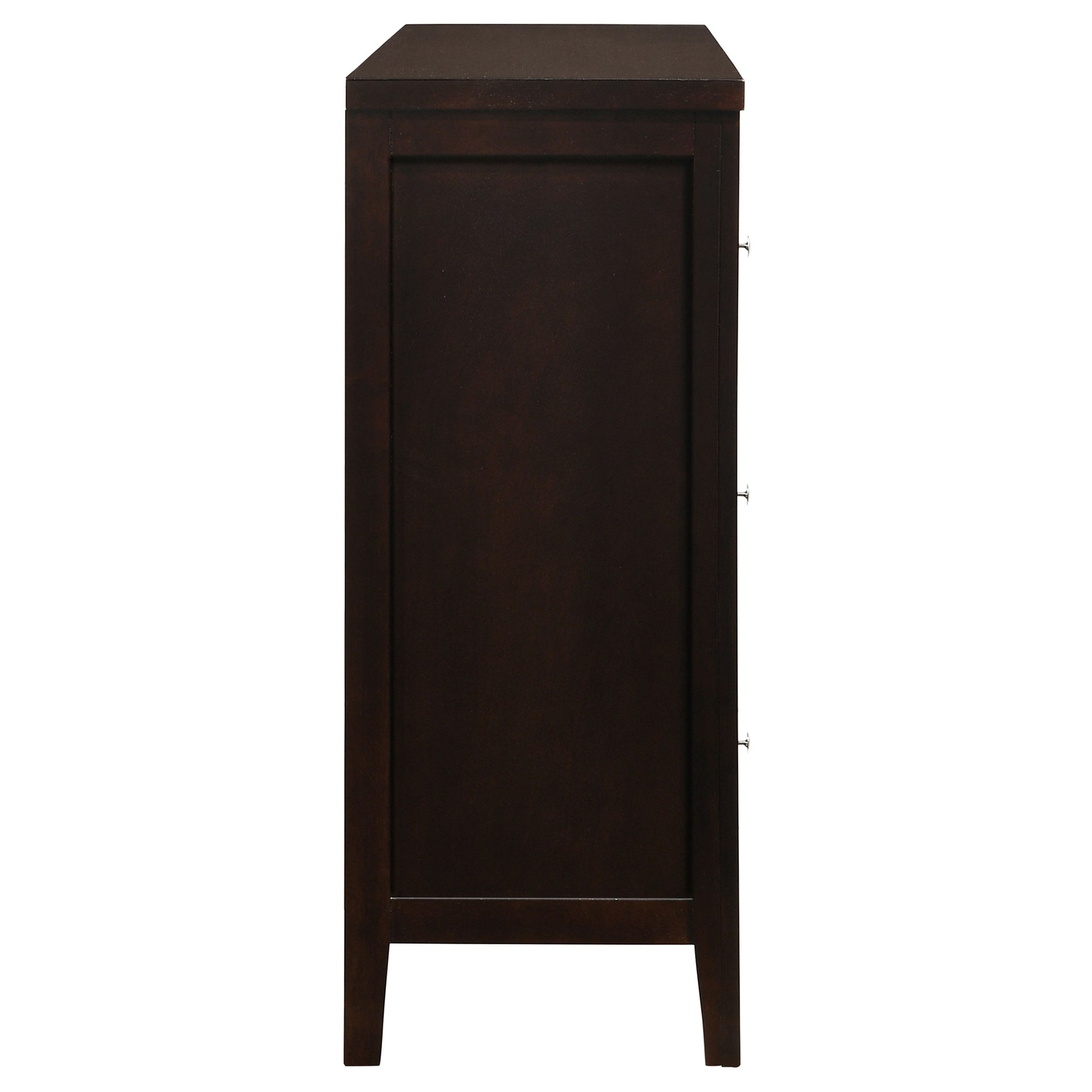 Bring timeless charm and functionality to your bedroom with this six-drawer dresser. Finished in a rich cappuccino tone, it showcases clean lines, brushed silver hardware, and a sturdy wood frame. Six spacious drawers offer generous storage for clothing and accessories, while the broad top surface provides space for décor or a mirror. Crafted from rubberwood, okume veneer, and engineered wood, this dresser blends durability with refined elegance to create a lasting bedroom essential.