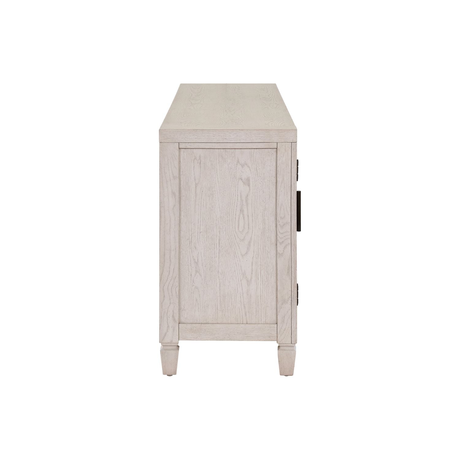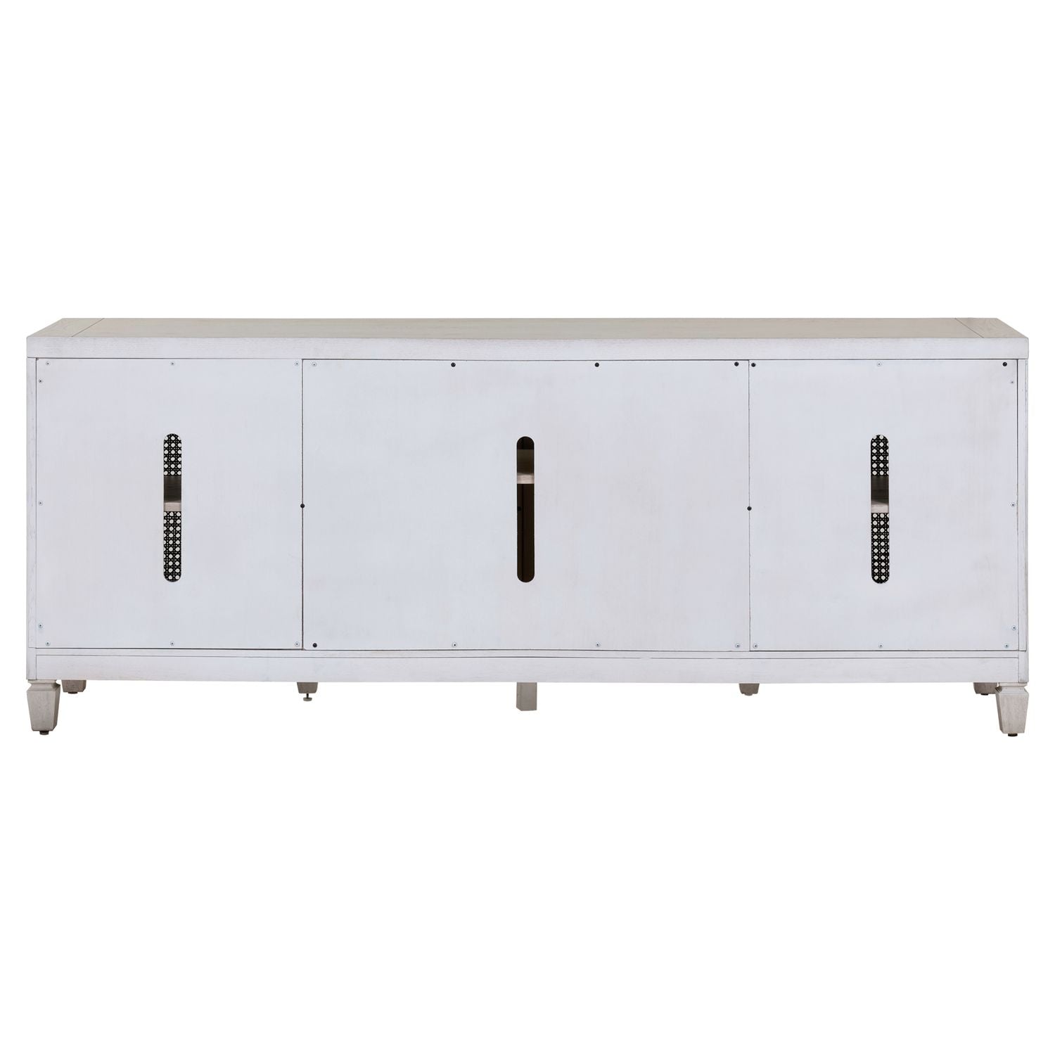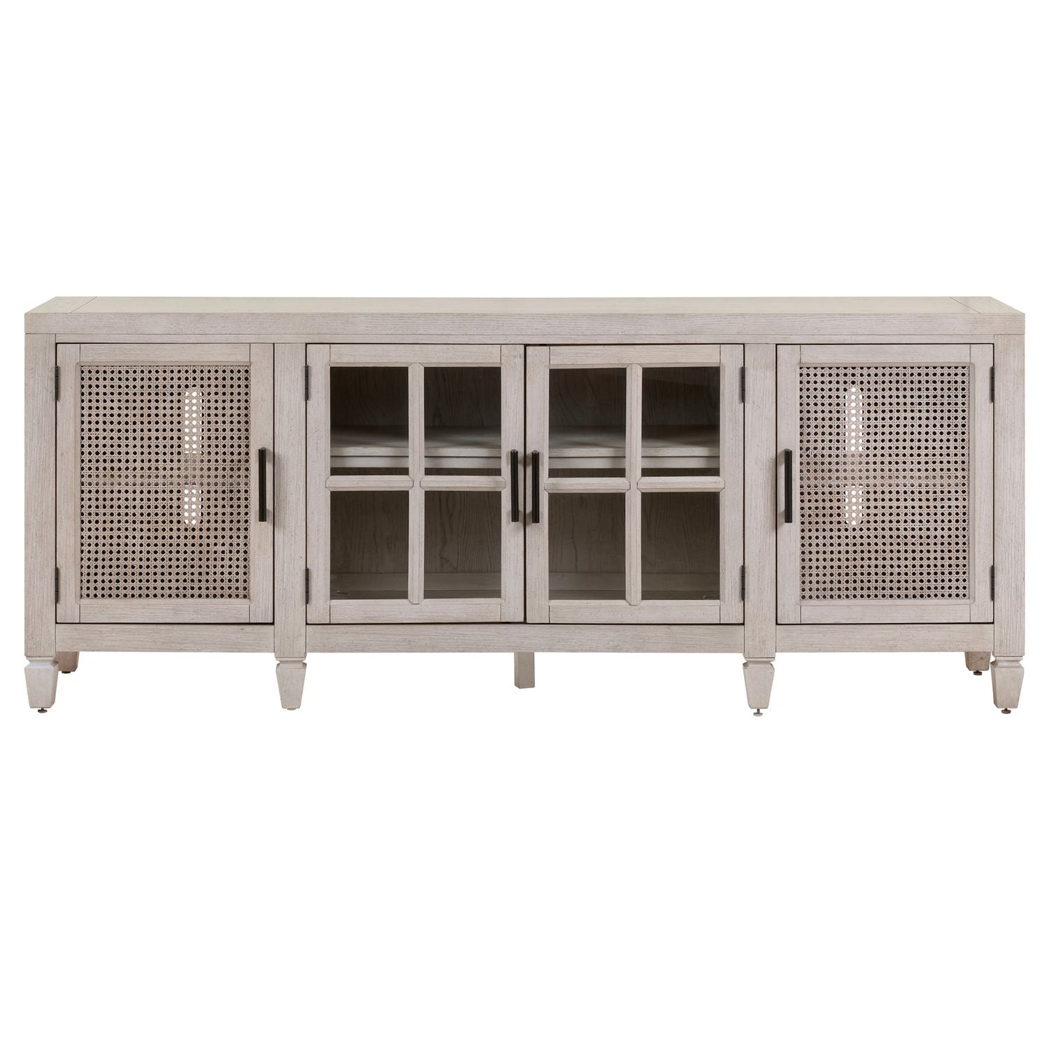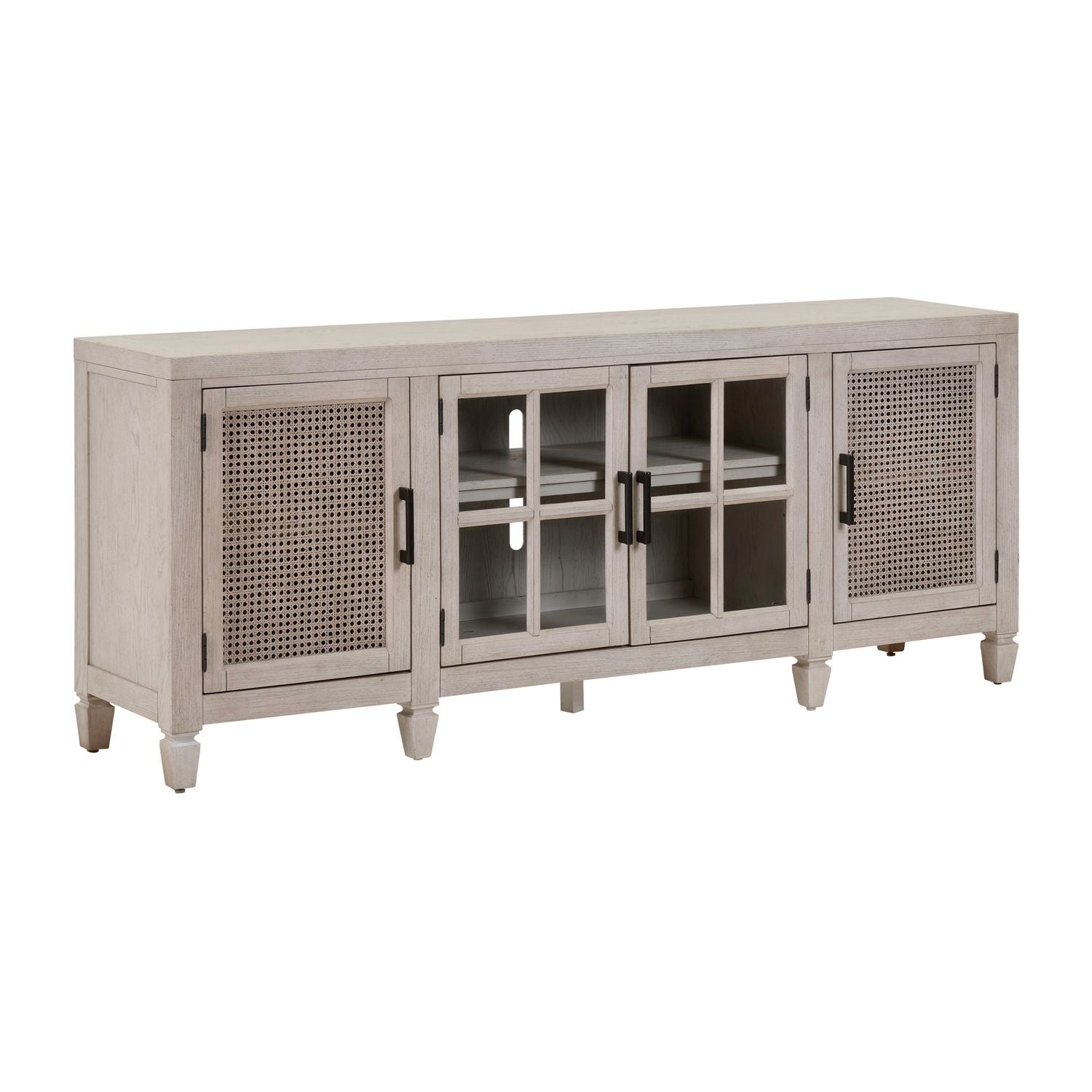 The Caruso Heights 82 inch TV console is the centerpiece that will anchor your living room with its timeless elegance and practical features. Crafted with care and attention to detail using Rubberwood and Poplar solids with Split Heart White Oak veneers, this piece features a Whitestone finish. At first glance, the console captivates with its grandeur, stretching 82 inches wide to accommodate even the largest of screens. But it's the intricate details that truly set it apart. Two wood-framed doors, adorned with cane panel accents, add a touch of rustic charm, while two additional wood-framed glass doors, featuring wood mullions for a window pane effect, infuse the console with a sense of sophistication and warmth. Behind each outside door lies one adjustable wood shelf, providing ample space for storing media essentials or displaying treasured keepsakes. And nestled behind the set of center doors awaits a large adjustable wood shelf, offering even more versatility and convenience for organizing electronics and accessories. But practicality doesn't end there. Wire management provisions ensure that cables and cords remain neatly organized and out of sight, maintaining a clean and clutter-free appearance. Framed end panels add a touch of refinement, while square tapered feet provide stability and support, ensuring that the console stands firm even under the weight of its contents. To complete the look, Antique Bronze bar pull hardware adorns the doors, adding a subtle yet striking accent that ties the entire piece together. Whether gracing a cozy family room or a spacious entertainment area, the Caruso Heights 82-inch TV console is more than just a place to display your screen—it's a statement of impeccable taste and unwavering quality, designed to enhance your home and elevate your entertainment experience for years to come.