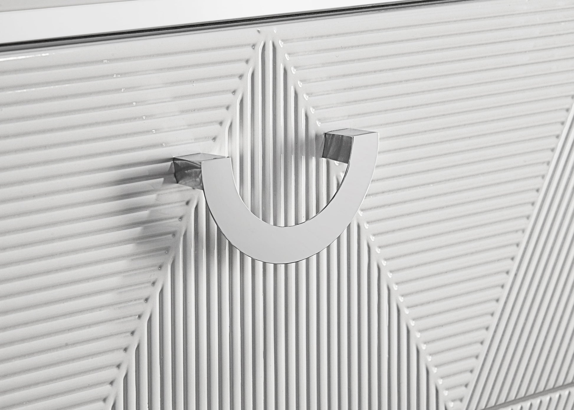 Sophisticated and dimensional, this six-drawer dresser and mirror set makes a bold statement in a high-gloss white finish. The dresser features geometric drawer fronts with fine ribbed texture forming inverted V patterns, paired with polished chrome U-shaped pulls. Black felt lines the top drawers for a touch of refinement, while 45mm metal extension glides ensure smooth operation. Above, the matching mirror glows with integrated white LED trim for ambient lighting and crisp contrast.