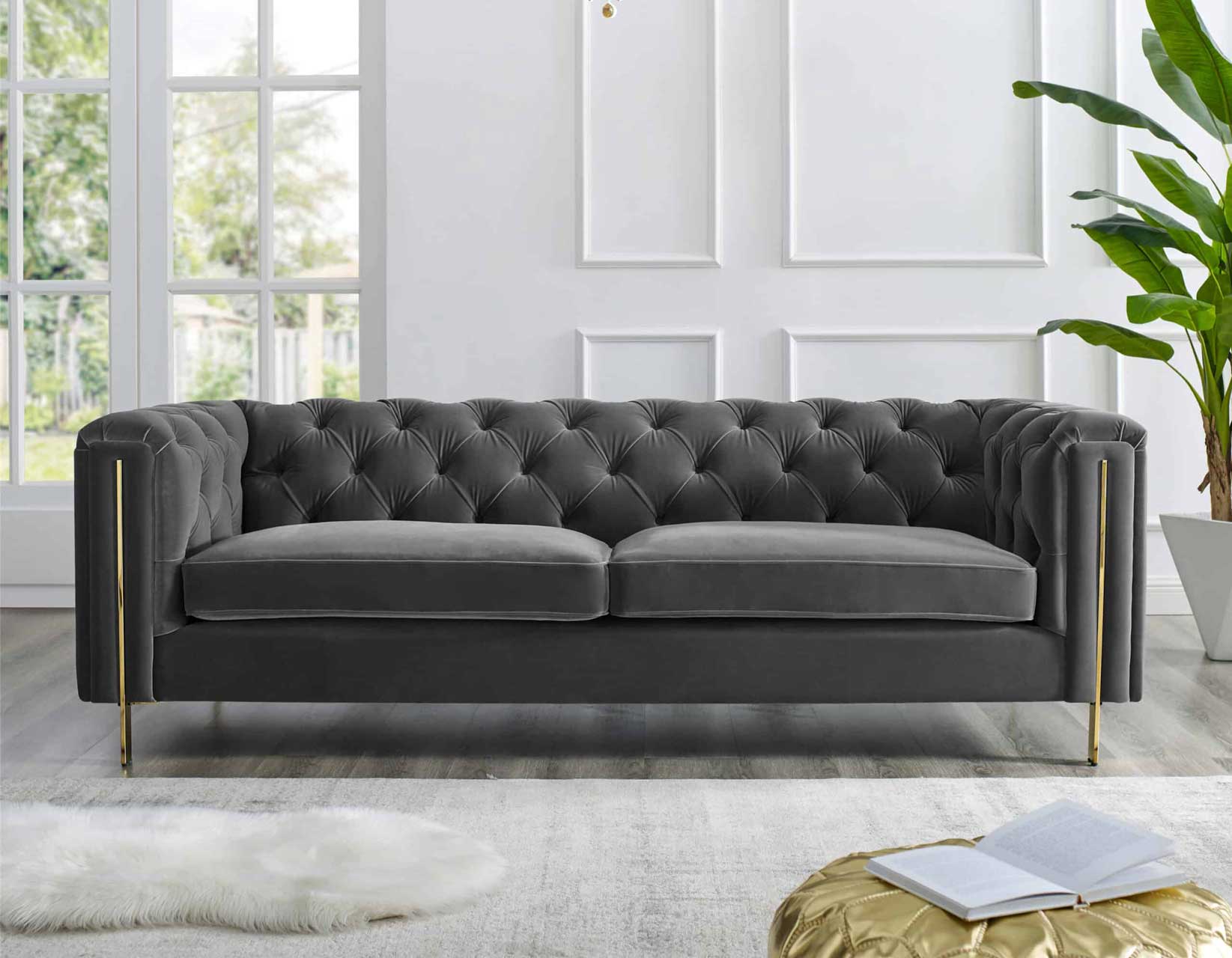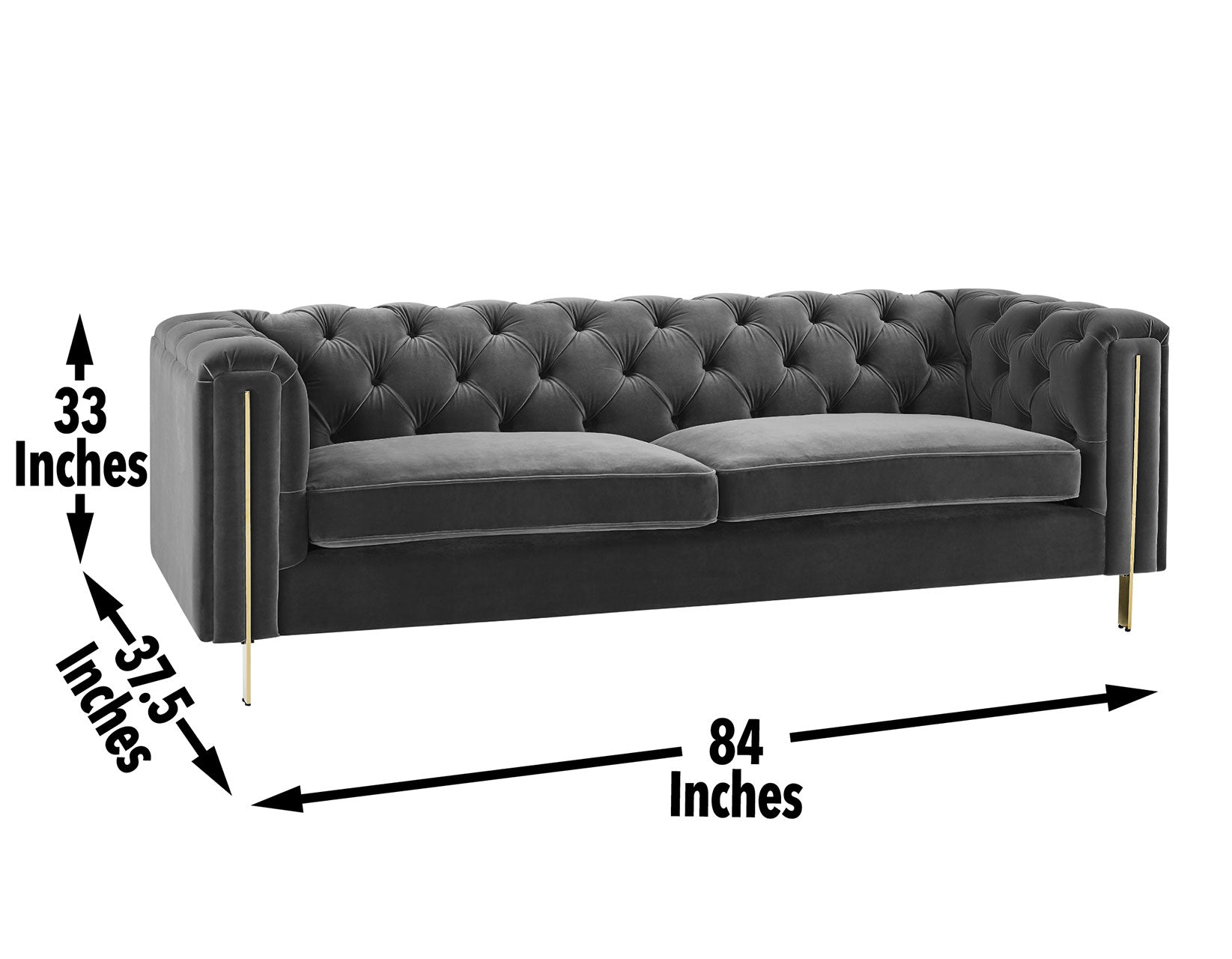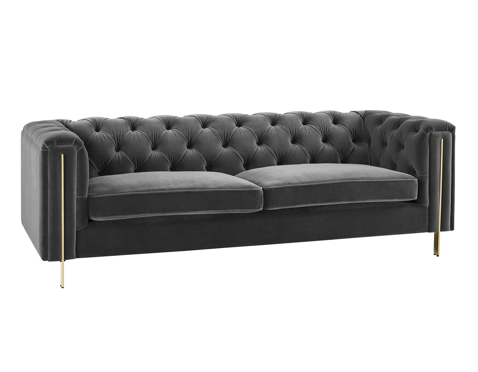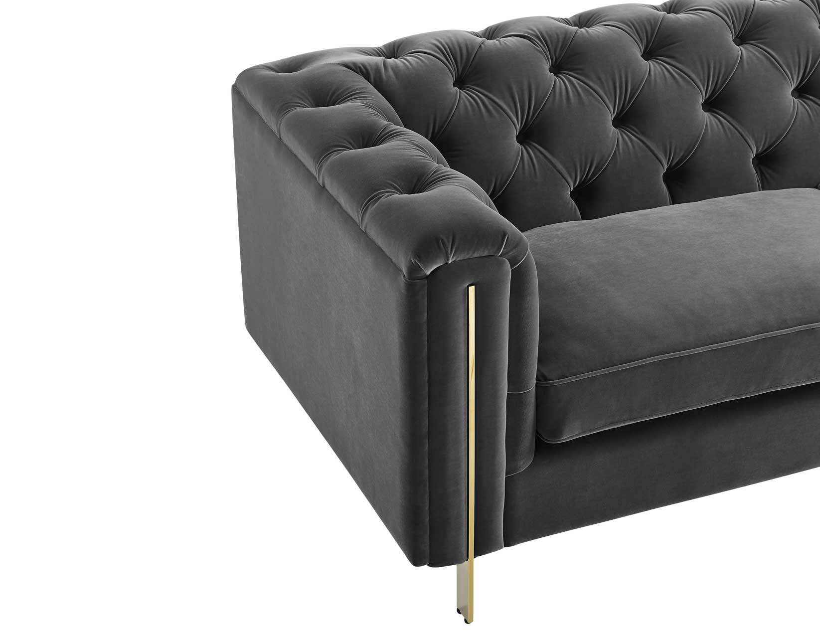 Fabulously elegant and yet wonderfully comfortable,Charlene blends classic and contemporary styles in a modern silhouette you won’t be able to take your eyes off. Curl up with a book on a rainy Sunday afternoon or entertain friends with this frame people will fight over. Butter-soft velvet is draped over a classic Chesterfield frame and then button tufted in an Old English look. A modern gloss brass frame adds a level of pop to the presentation that freshens up a classic upholstered silhouette. Choose from a bold blue or neutral gray velvet in Sofa or Loveseat for an elegant yet fun center to any living area.
