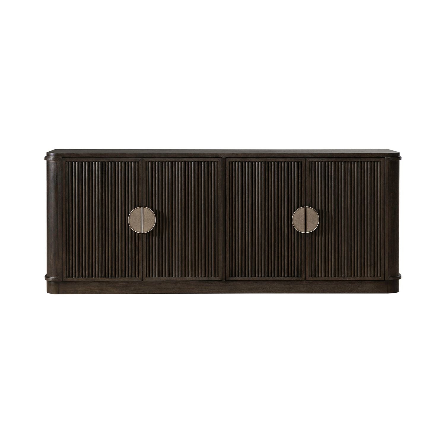Give your home a personal touch that reflects your passions and personality with the City View 82 inch TV console. Meticulously crafted using Rubberwood solids and Quartered White Oak veneers, this piece features a Coffee Bean finish. The standout feature of this console is its reeded doors, adding a touch of sophistication and texture to its design. Complemented by Dark Bronze Half-Moon pull hardware, these doors exude a sense of understated luxury. The softly rounded pilasters further enhance the console's aesthetic appeal, while the plinth-style base lends stability and a touch of classic charm. Opening the doors reveals the thoughtful interior design of the console. Each set of doors is equipped with European soft-close hinges and magnetic door catches, ensuring smooth and silent operation. Inside, you'll find one adjustable wood shelf behind each set of doors, providing ample space for organizing media accessories and devices. Additionally, wire management provisions allow for tidy cable organization, keeping your entertainment setup clutter-free and visually appealing. Whether you're hosting a movie night with friends or enjoying a quiet evening at home, the City View 82 inch TV console effortlessly combines style and functionality to meet your entertainment needs.