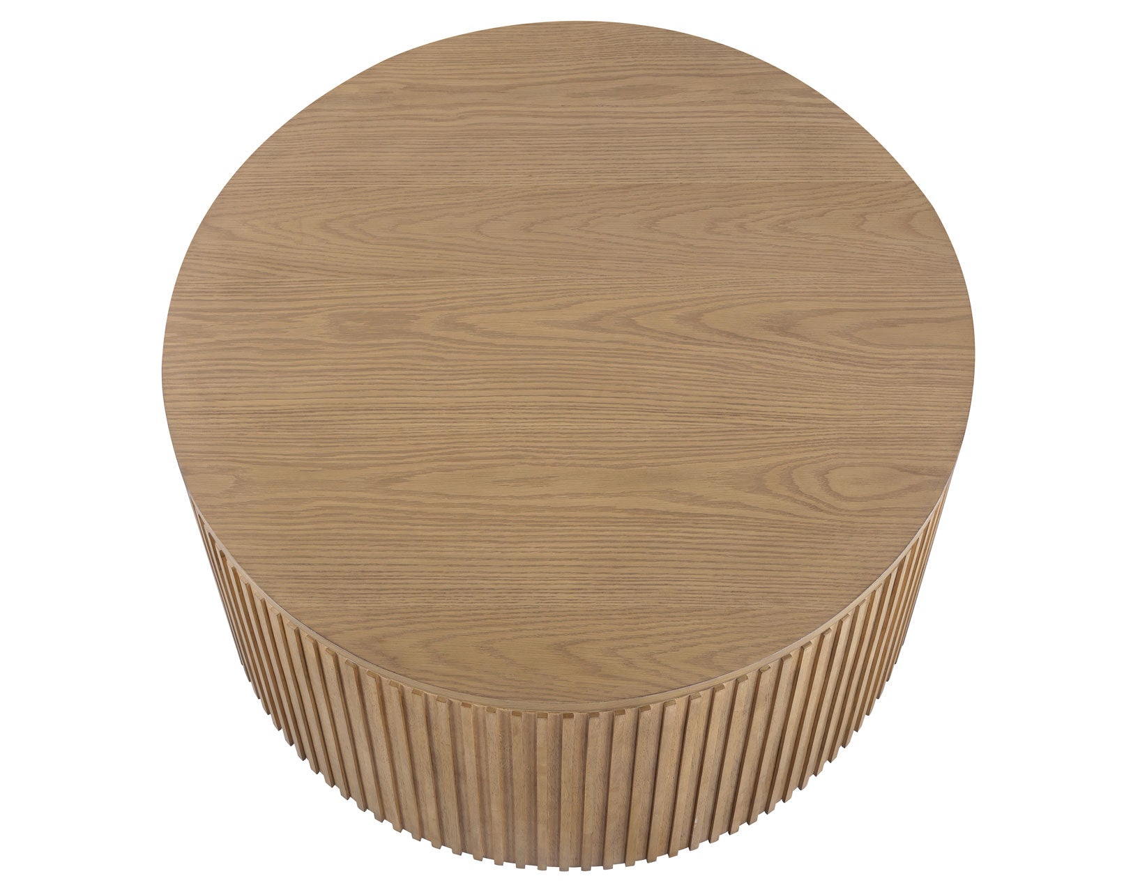 Inspired by Art Deco and Empire styling, the Colvin 36″ Round Coffee Table adds refined elegance to any space. Its oak-veneered top in a warm toffee finish and reeded base bring timeless sophistication, ideal for those who appreciate sleek design. Featuring casters for easy mobility, this table is perfect for repositioning in front of a sofa or moving for cleaning. The spacious round top offers ample room for decor or essentials, combining luxury, practicality, and versatility to elevate your home’s style.