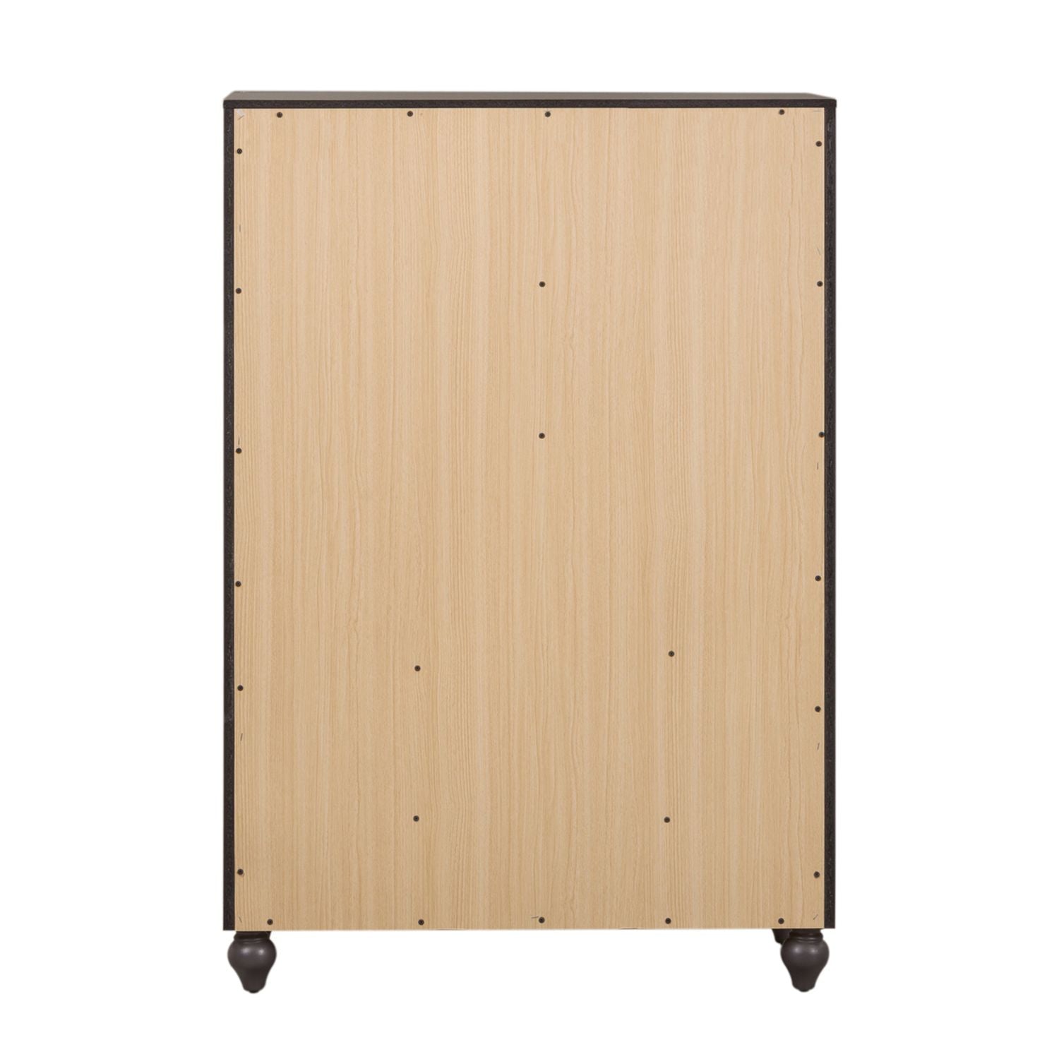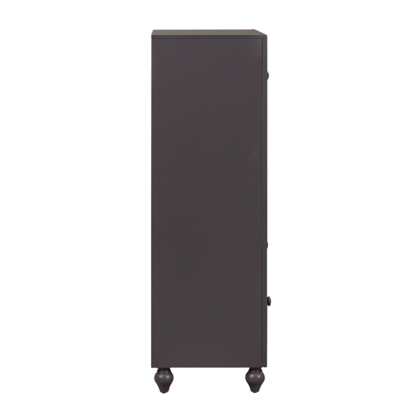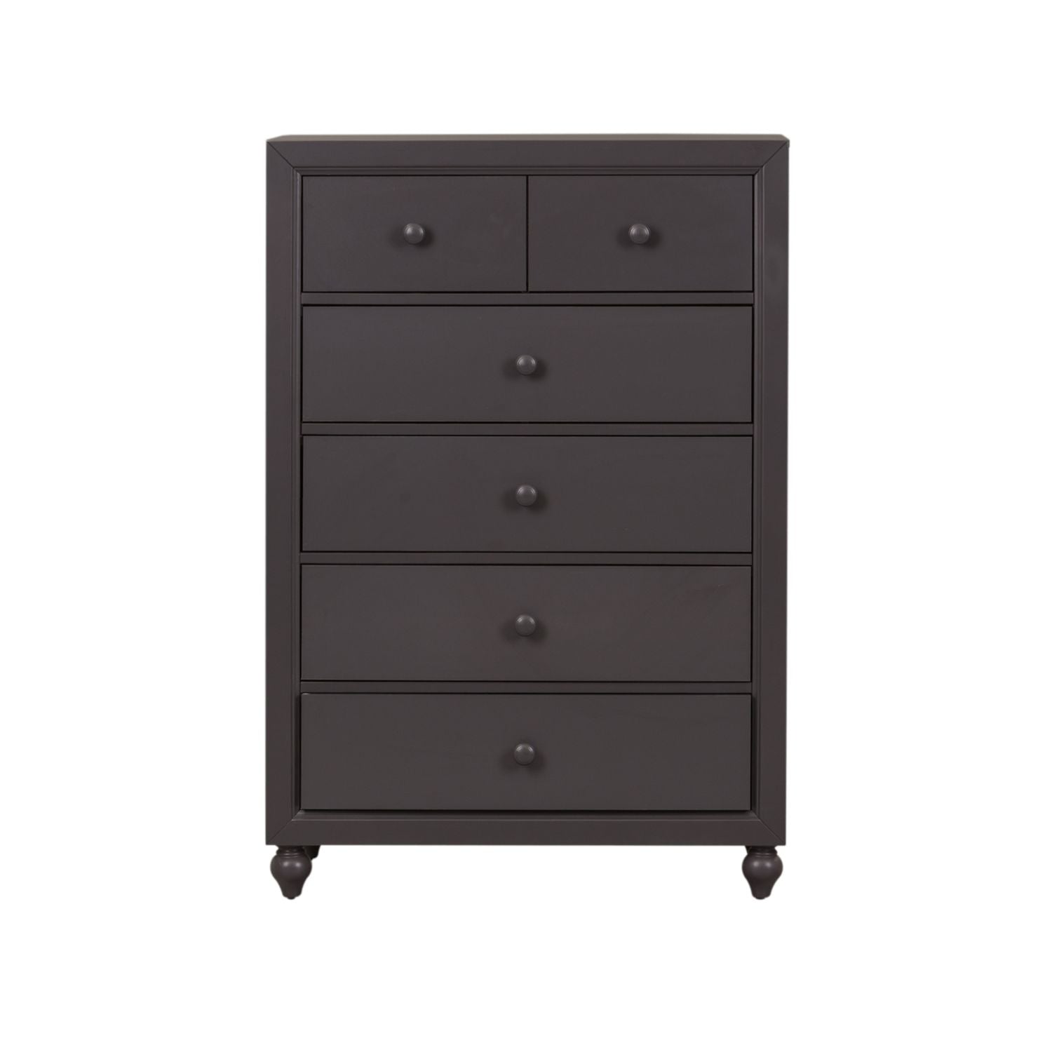 Indulge in cottage design with the Cottage View 5 drawer chest. Crafted by melamine and a rubberwood solid frame, this piece features a dark grey finish, kenlin drawer glides, bottom case dust proofing, solid wood picture framed molding, laminate drawer interior, bluff cut top drawers, wood knob hardware, and is anchored by bun feet. This piece is available in an alternate finish and the melamine is scratch resistant, sure to make this piece last in any home.