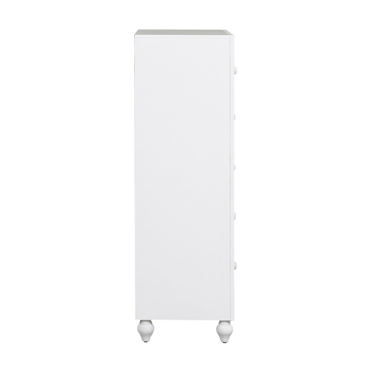 Indulge in cottage design with the Cottage View 5 drawer chest. Crafted by melamine and a rubberwood solid frame, this piece features a clean white finish, kenlin drawer glides, bottom case dust proofing, a laminate drawer interior, bluff cut top drawers, solid wood picture framed molding, bun feet, and is acented by wood knob hardware. This piece is available in an alternate finish and the melamine is scratch resistant, sure to make this piece last in any home.