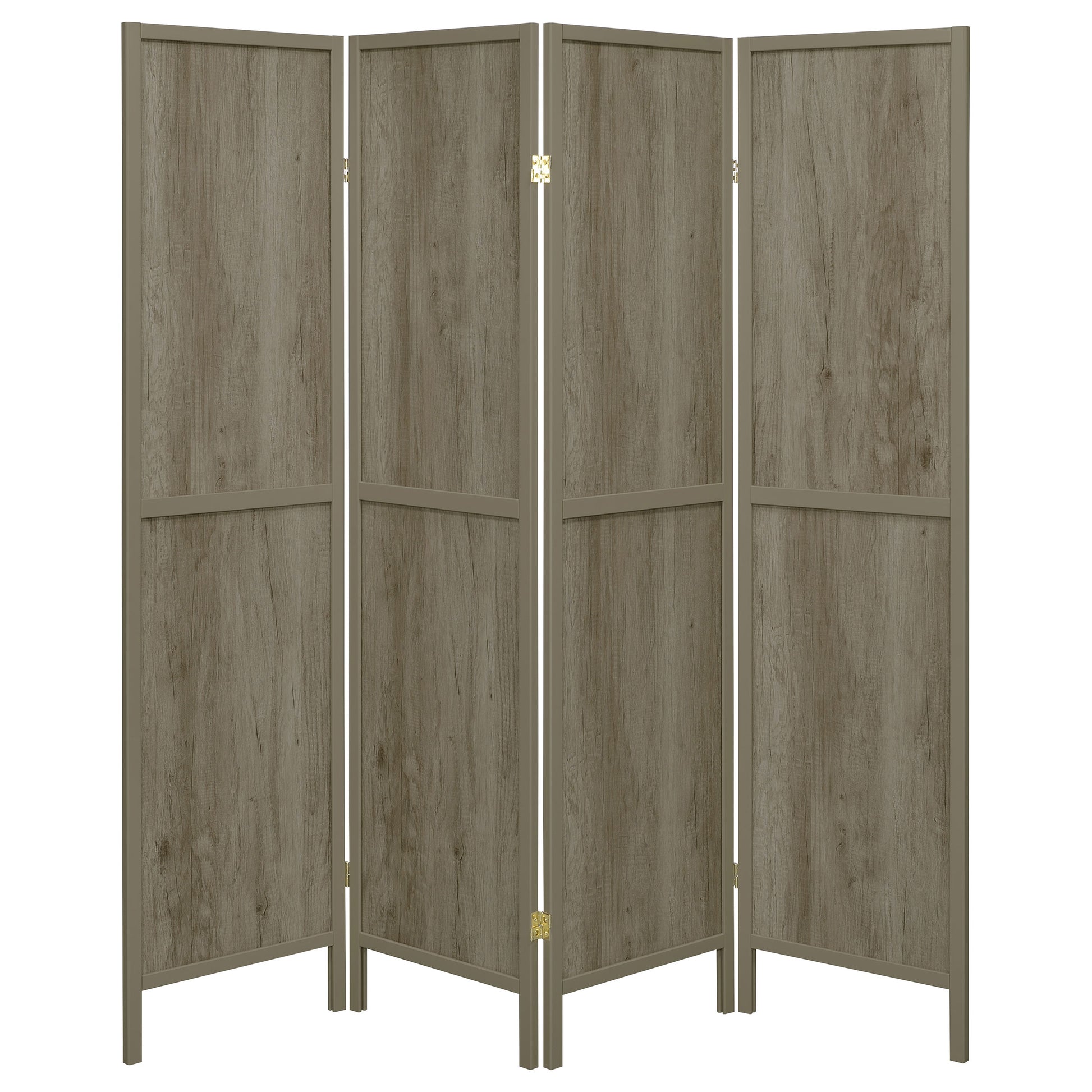 • Four-panel folding room divider in grey driftwood with rustic wood grain appeal