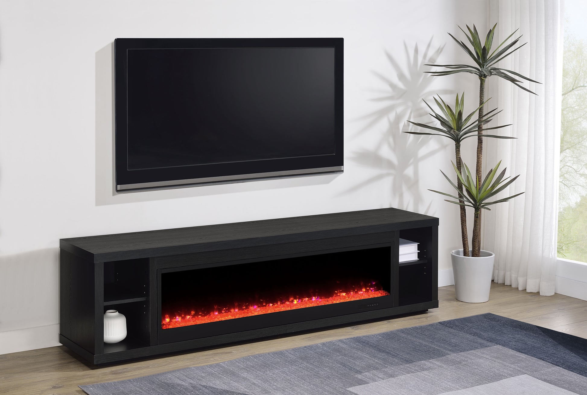 This sleek fireplace media console brings warmth and streamlined storage to contemporary living spaces. A wide electric firebox glows over crushed acrylic crystals, offering fifteen customizable flame colors operated by a wireless remote. Open side compartments with adjustable shelves store devices or décor, while rear cable management cutouts keep wires out of sight. Finished in classic black and crafted from engineered wood with a laminate veneer, it serves as a refined TV stand or entertainment center. Please note that this console does not include a heat function.