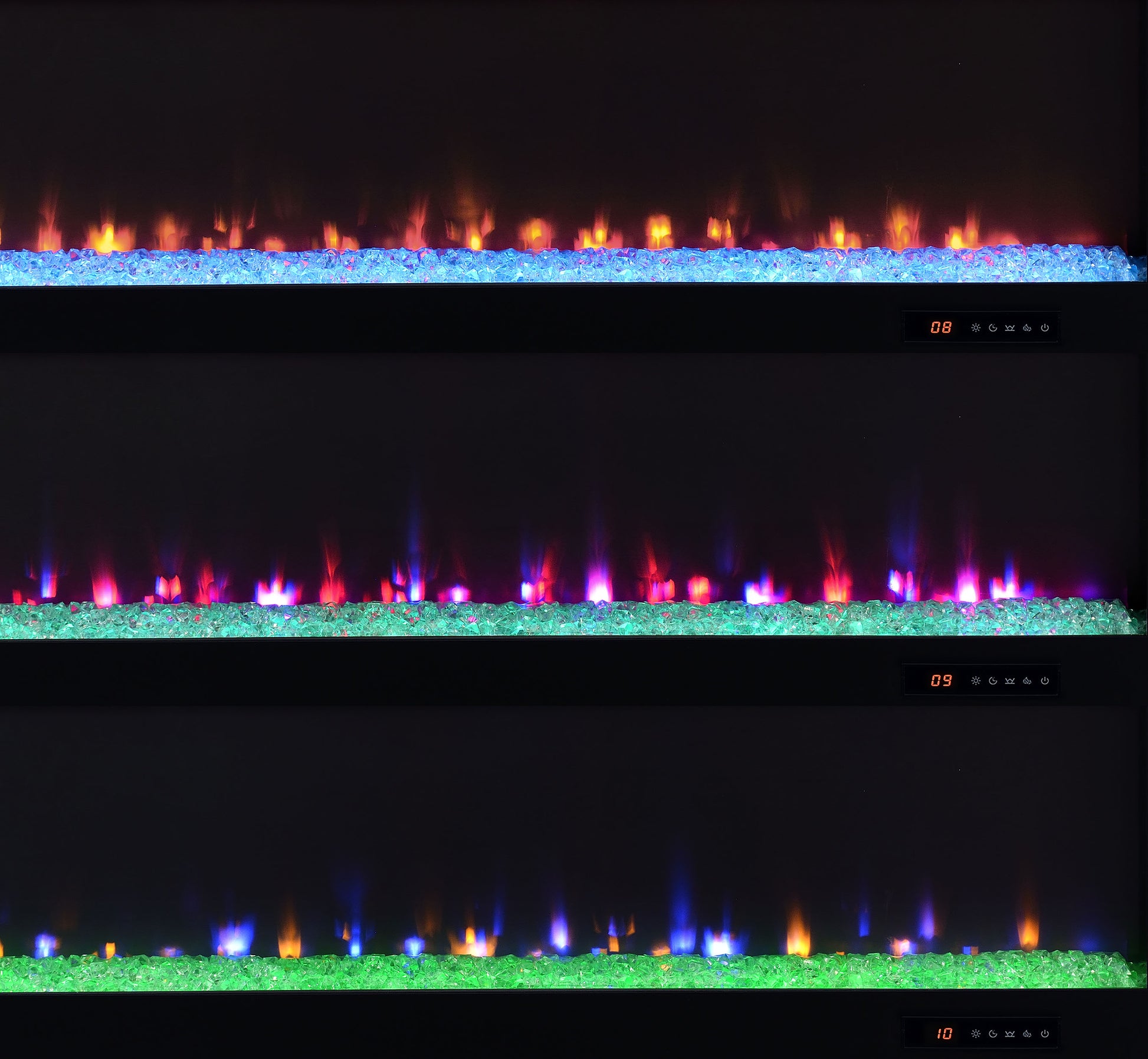 • TV stand fireplace console with flame visualizer and crushed acrylic crystals for visual warmth