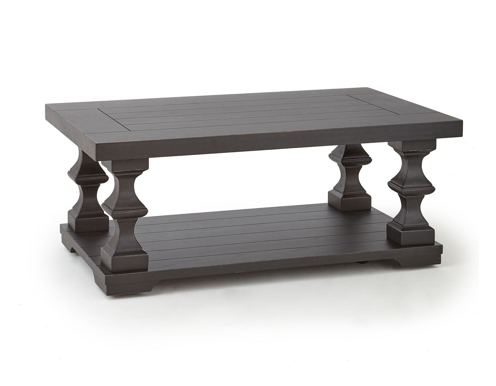 A new take on classic farmhouse styling, the Dory occasional collection looks like it was plucked out of an English pub. The neutral ebony finish and plank top will blend well with any casual decor whether rustic or cottage styling. Beefy tops and sculpted posts combine with a large scale to give the collection a very substantial feel.