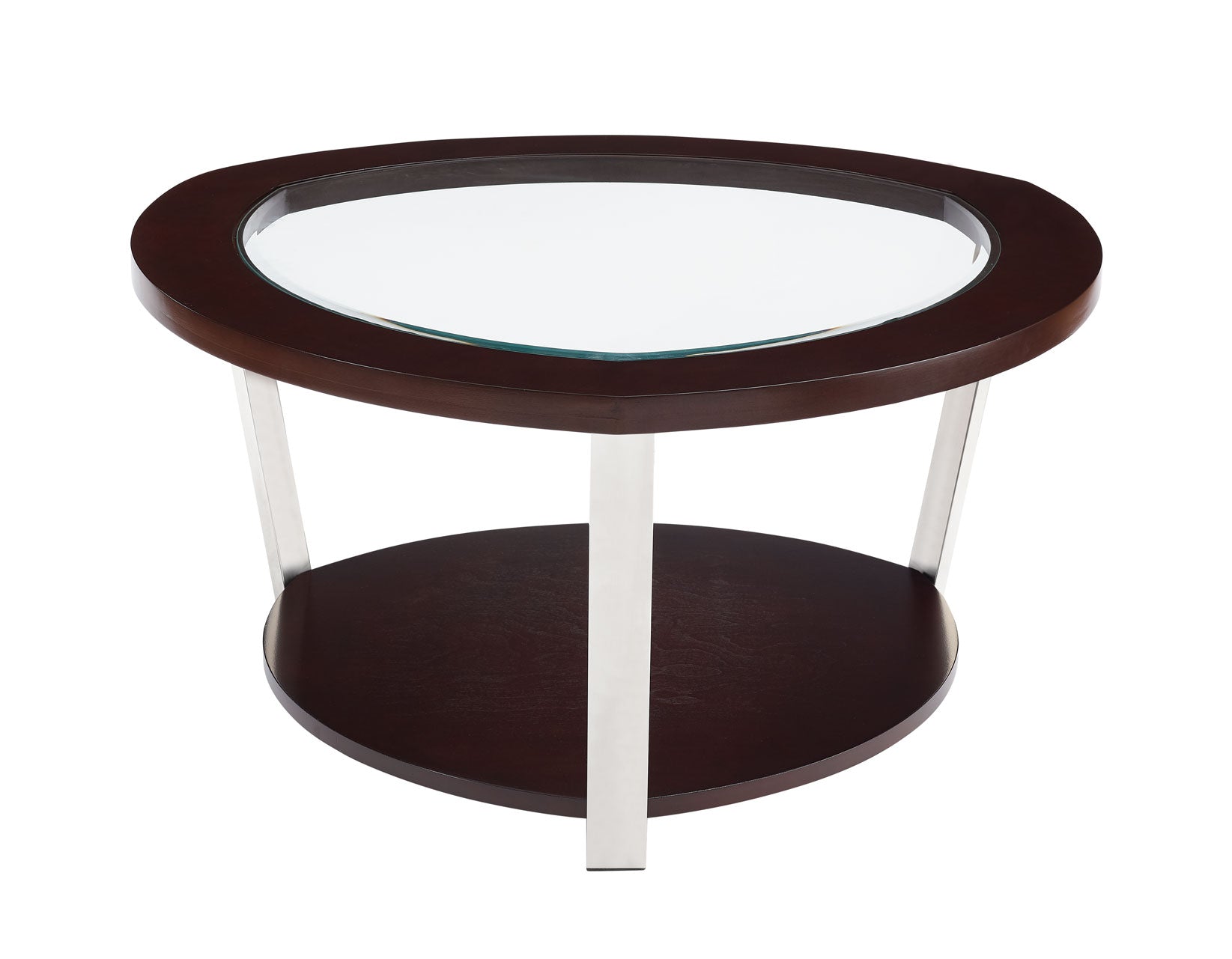 A contemporary styled occasional Cocktail Table of stainless steel, wood and glass construction, Duncan features a spherical triangular shaped top that will instantly add interest to any room. A rich mixture of elements and espresso finish combine for a sophisticated modern look.