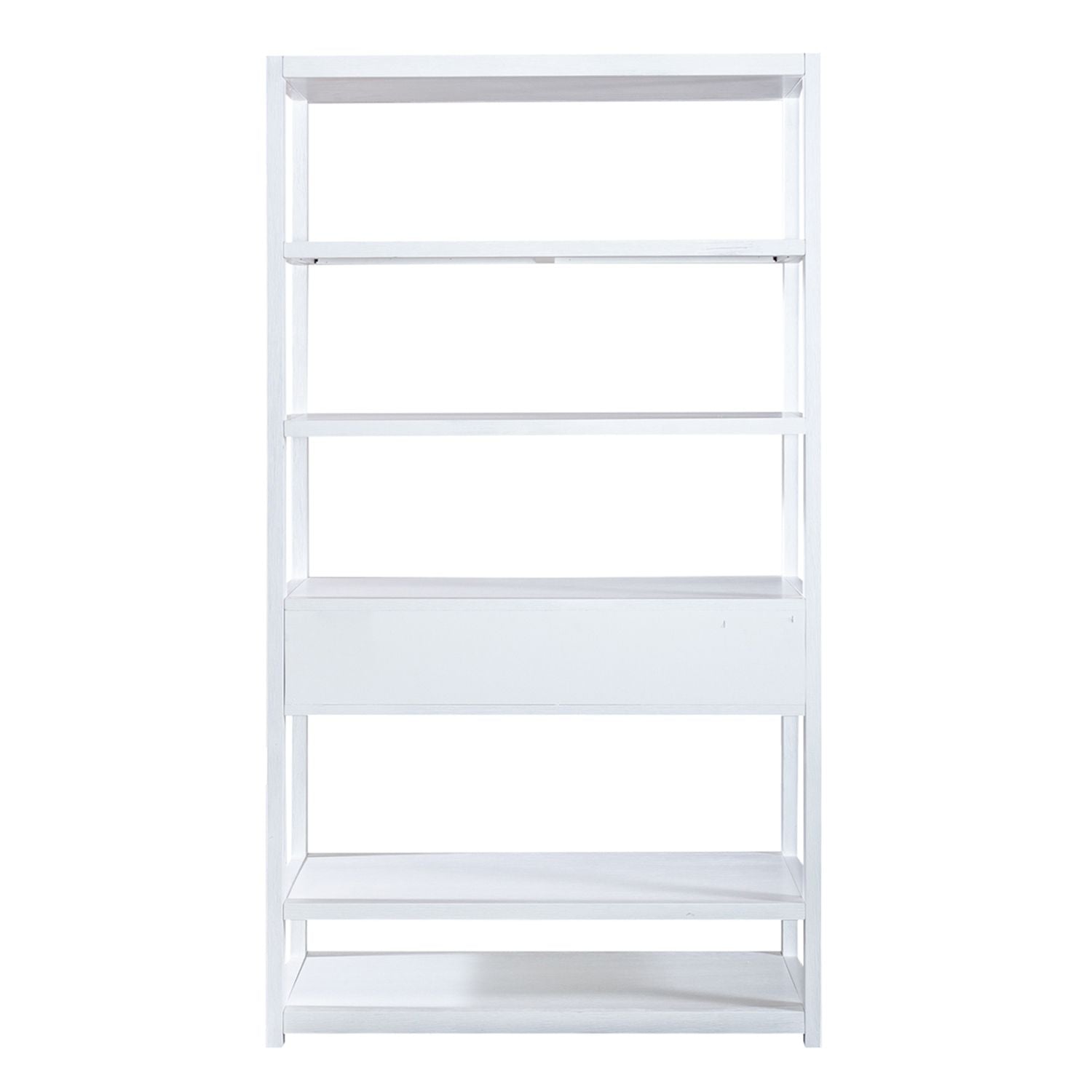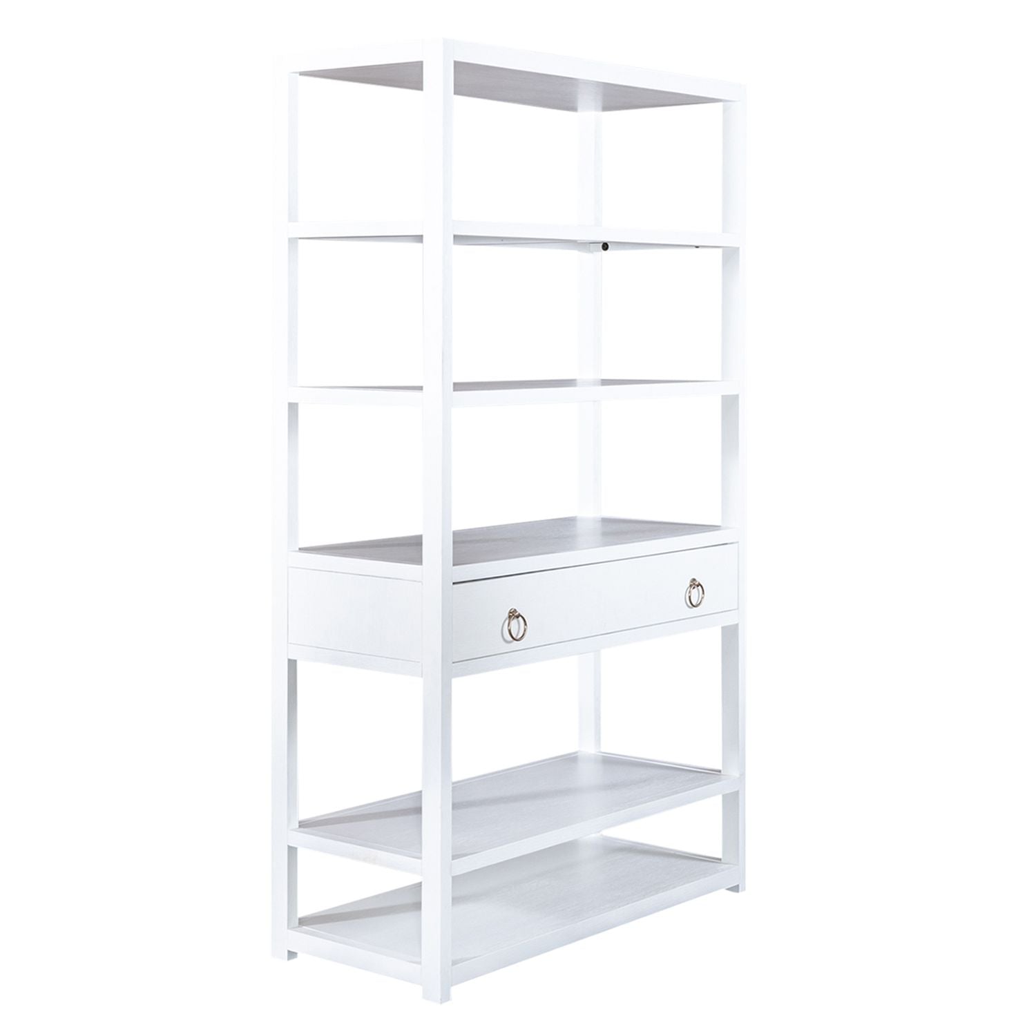 Turn your house into a home with the eclectic East End accent bookcase. Crafted of Acacia Solids and veneers, this piece features a wire brushed white finish accented with brass ring hardware. This bookshelf offers six shelves for storage and display as well as a full extension drawer for additional storage. This piece is versatile enough to work in any room and transform the ordinary into the extraordinary. Unique and timeless, allow the East End accent bookcase to bring inspirational design into your home.