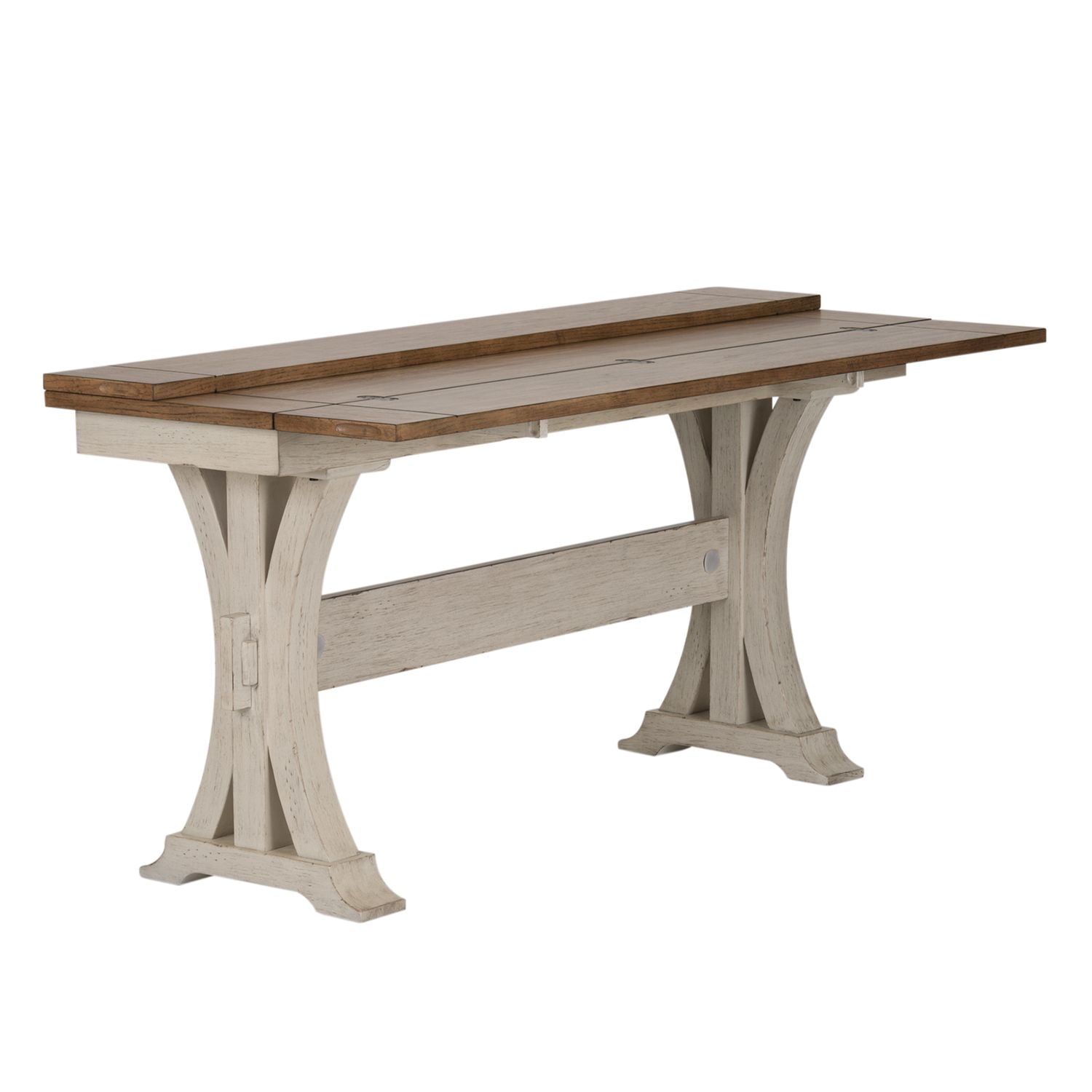 Elevate your space with the Farmhouse Reimagined flip lid sofa table. Crafted of poplar and pine solids with pine and cathedral hickory veneers, this piece features an antique white finish with a chestnut top, appealing double flip lid feature for extended table space, anchored by a uniquely shaped tapered leg design, and consumer-friendly assembly. This heavily distressed cottage style sofa table would make a great addition to any farmhouse space.