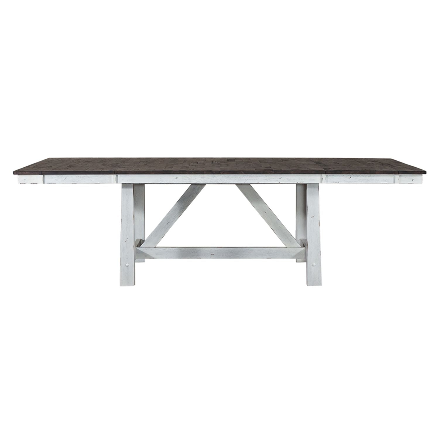 Gather the whole family with the Farmhouse trestle table. Crafted of rubberwood solids and veneers, this piece features a timeless heavy distressing, two removeable 18" leaves to comfortably seat up to eight, an "X" style trestle base, and a solid wood top. The two-tone white finish with wood tone tops creates a versatile look that is sure to be the perfect addition to any space.