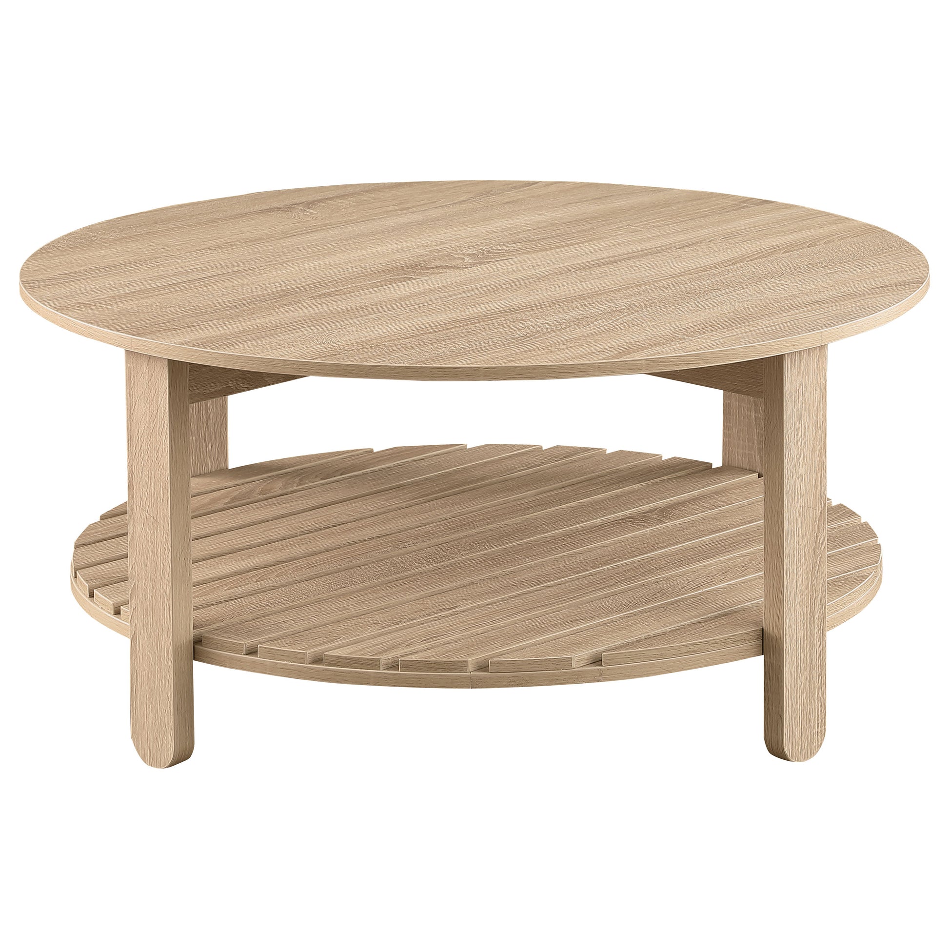 This round coffee table combines modern farmhouse charm with practical functionality. Made from engineered wood with an eco-friendly, scratch-resistant laminate veneer, it features a natural finish and subtle wood grain texture. The round tabletop offers ample surface space, while the slatted lower shelf provides additional storage. Built for durability and everyday use, this table is a stylish and sustainable centerpiece for any living room.