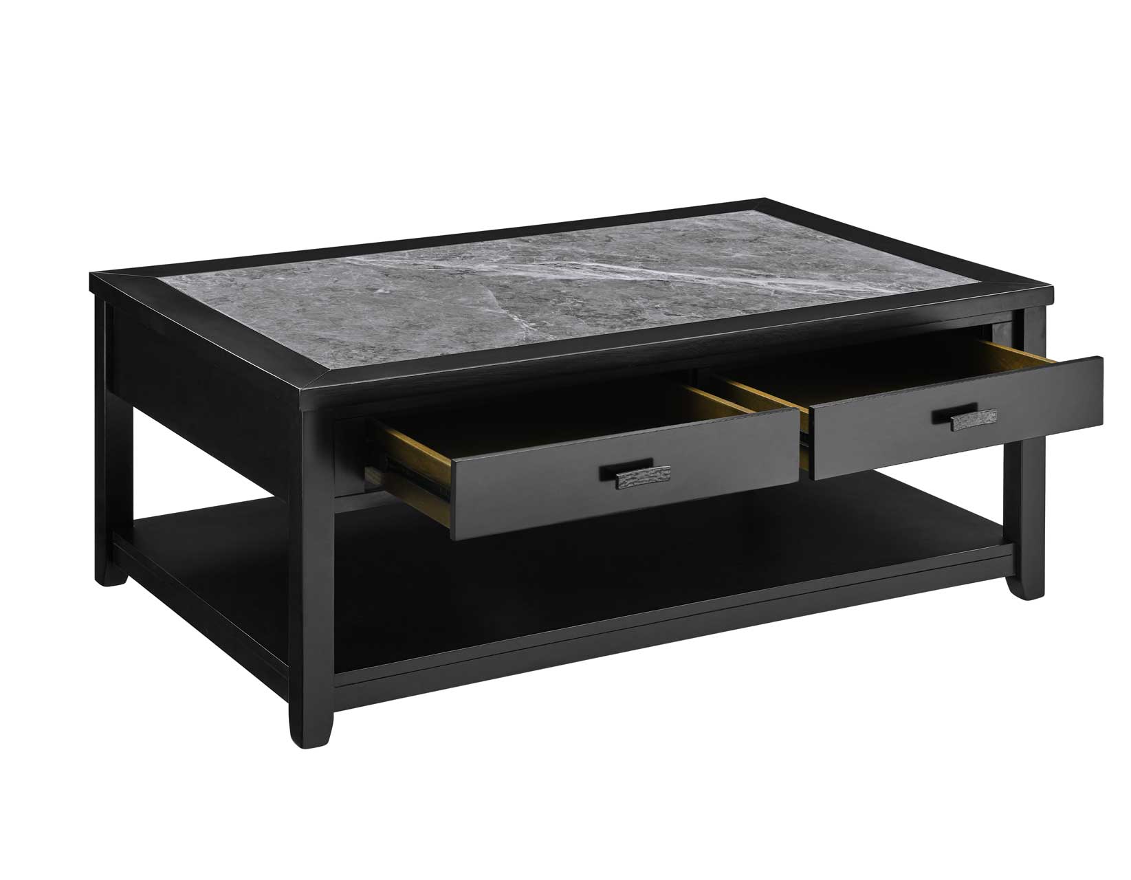 Transitional styling with a dark, smoky design, Garvine dresses up a living area with easy care style. Gray Sintered Stone tops add an elegant easy-care accent with enhanced performance features including moisture, scratch and heat resistance. Bottom shelves offer display or storage options while drawers in each piece offer valuable storage to a room. Cocktail and Two End Tables instantly update a living room – add the optional Sofa Table for a complete set.